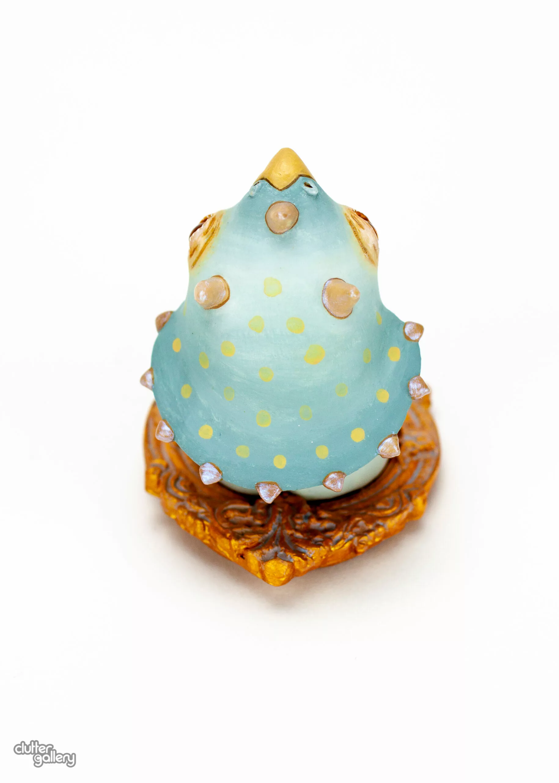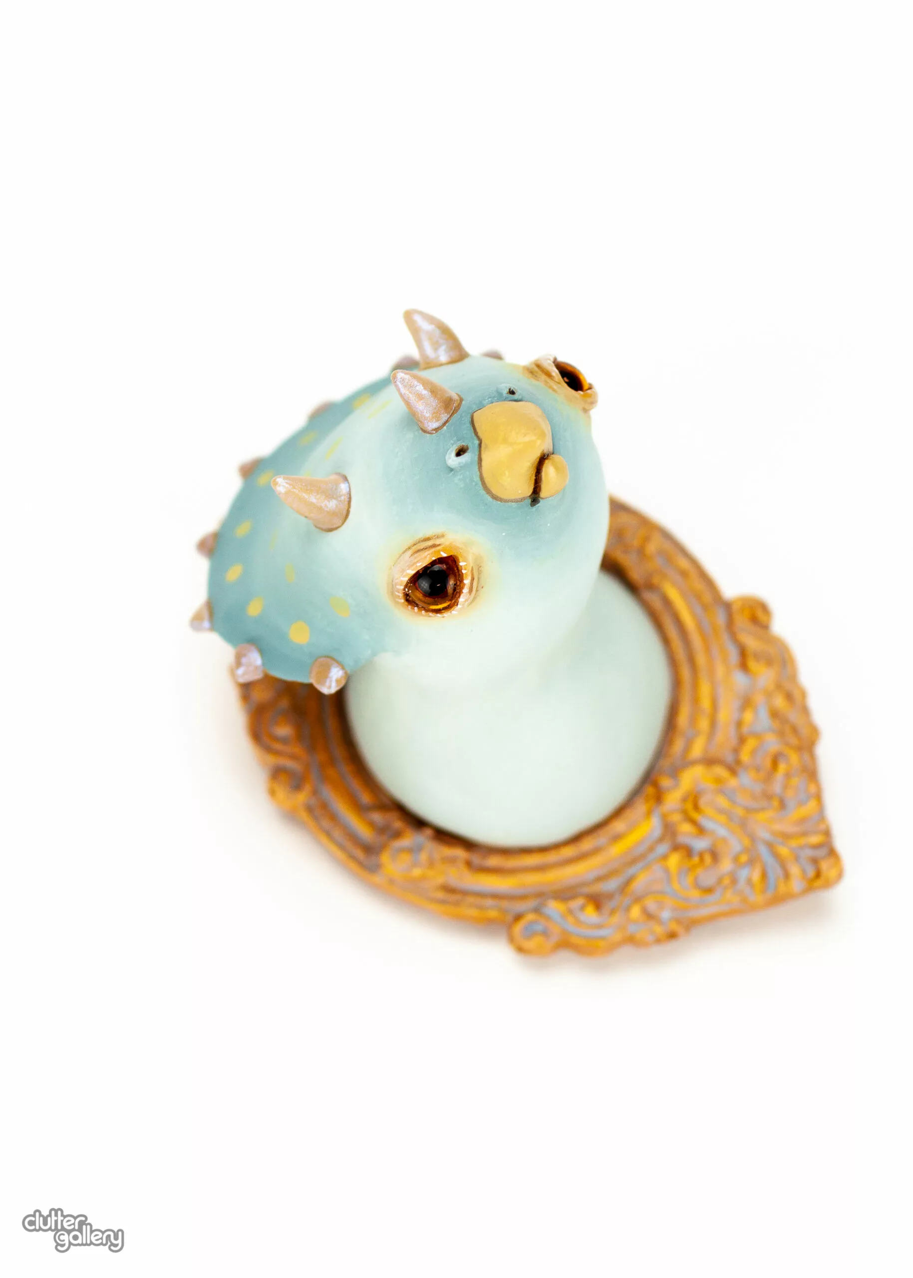 This is a one-of-a-kind, wall mounted work, painted with acrylics and covered with matte and gloss finish. The eyes are glass. Measures 2×3 inches