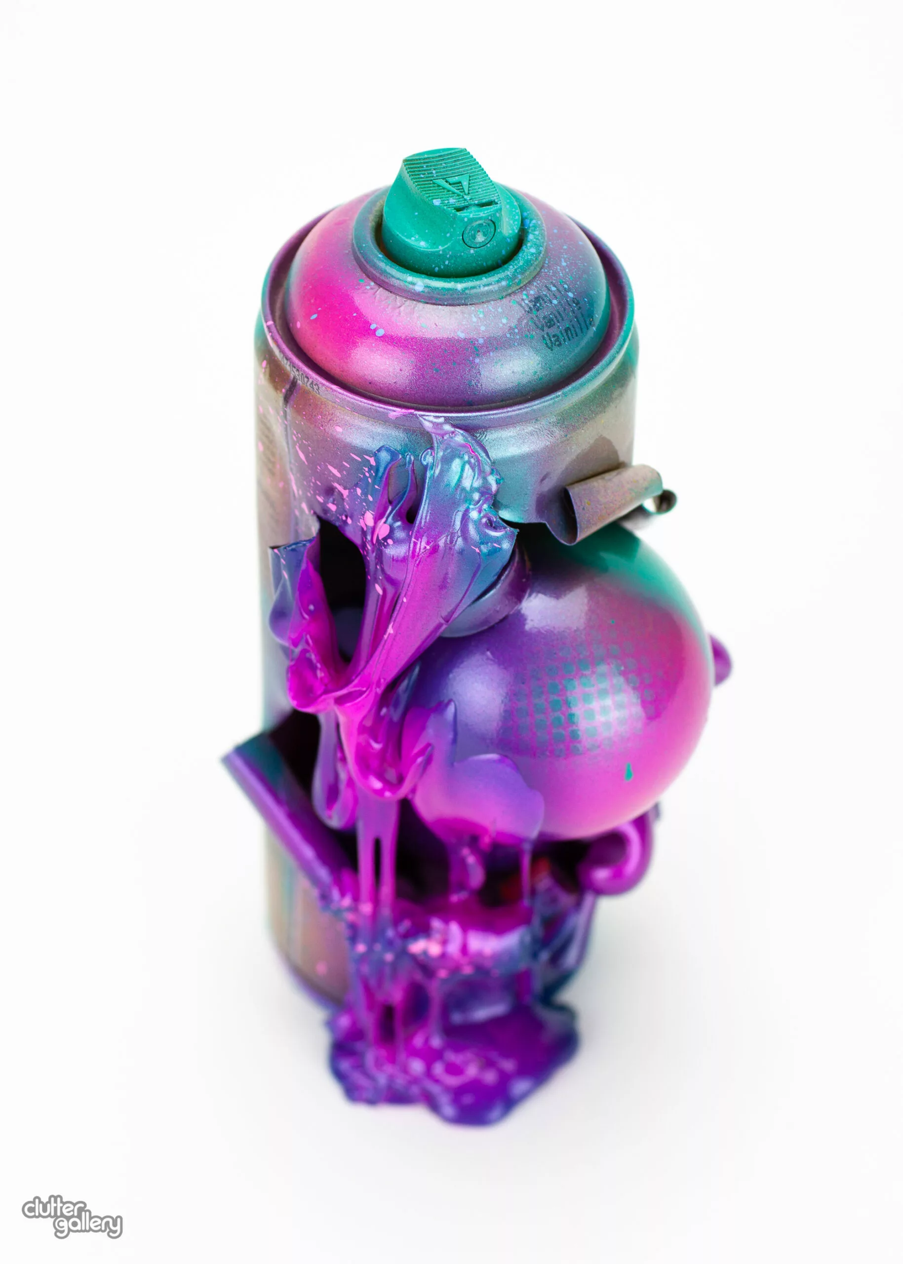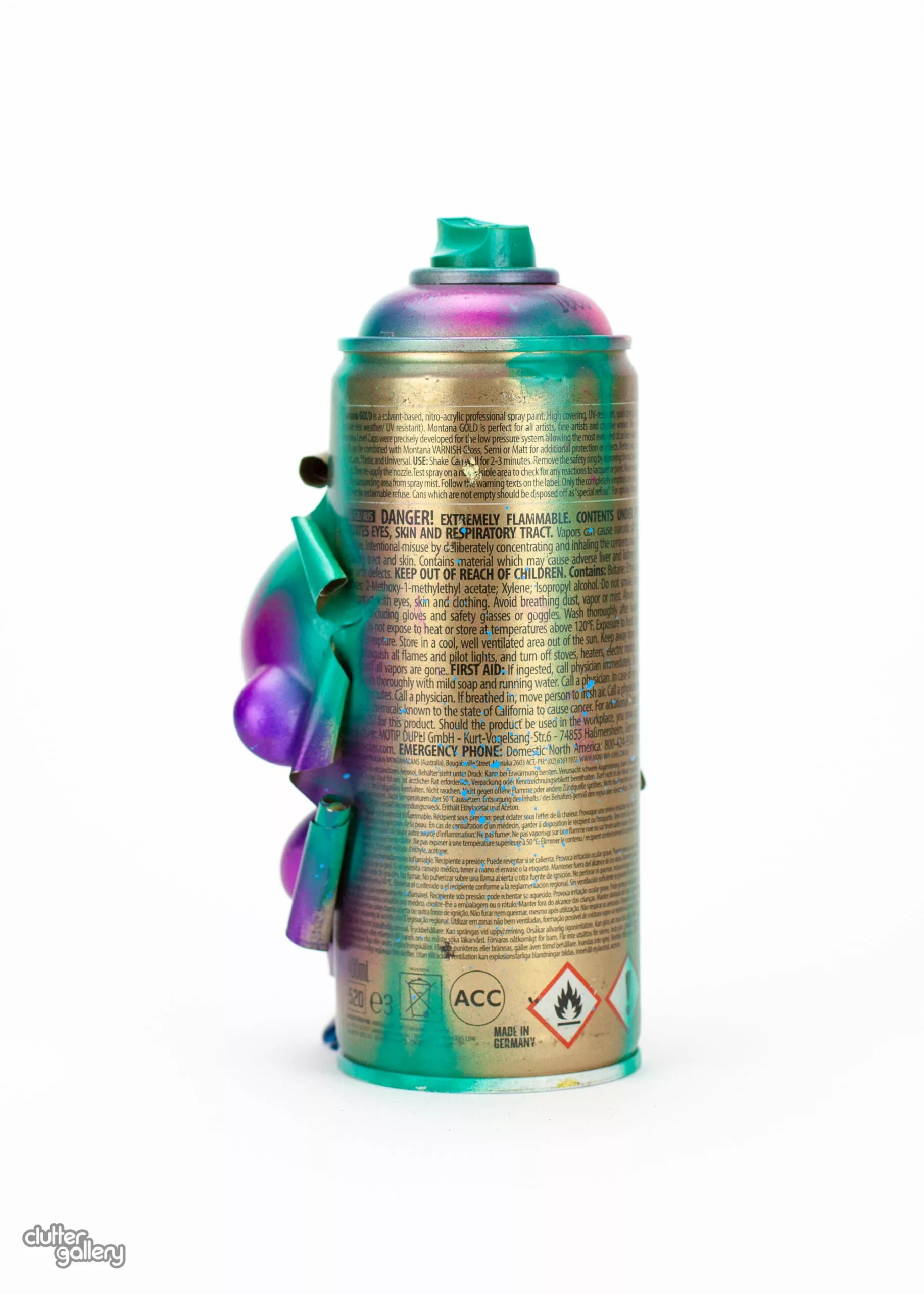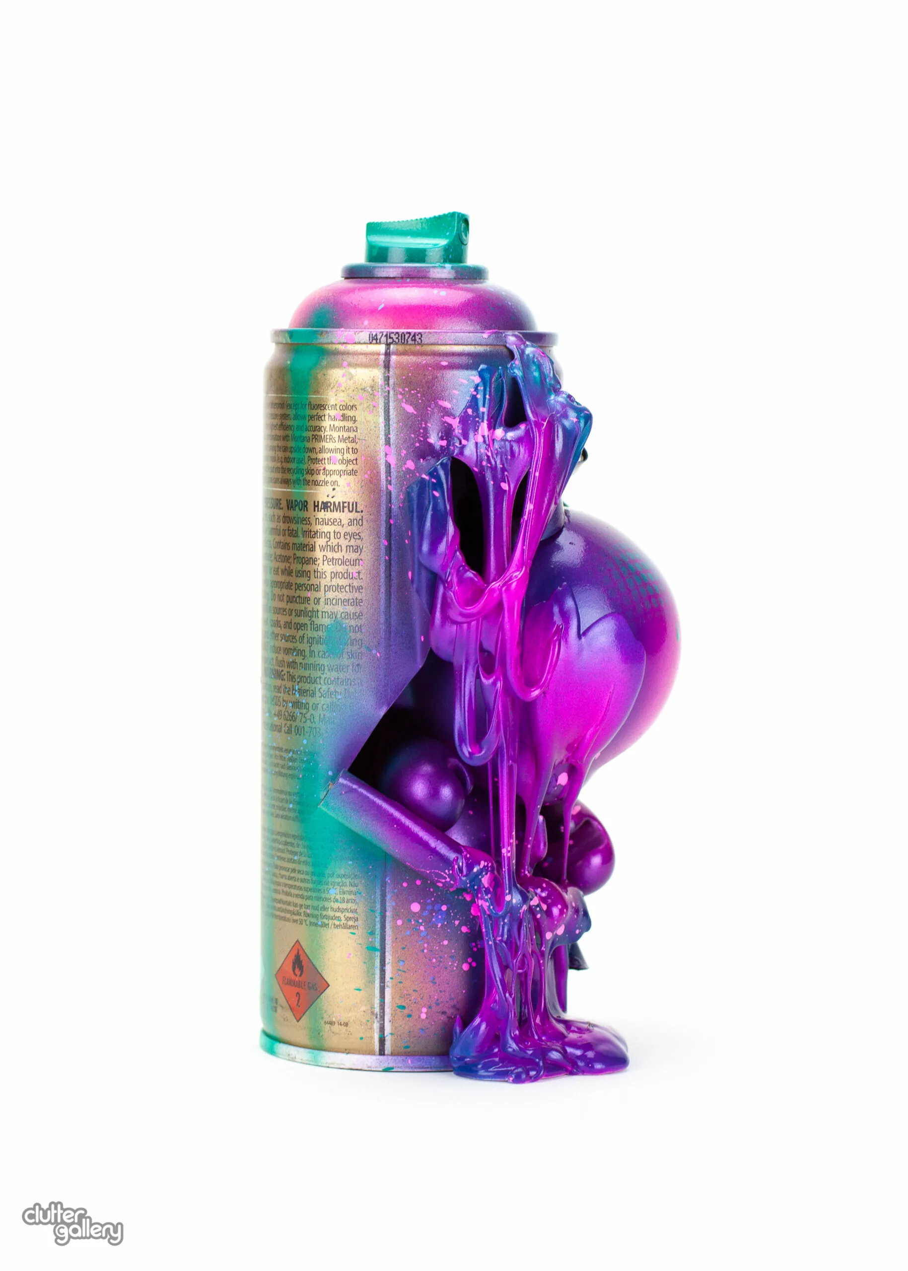 Color crafted bombers! Exclusive for Clutter Gallery’s gift wrapped art show, each of these “Bombers” features a 4” Kidrobot Munny busting out of a REAL spray paint can. Upcycled artwork, UV and Kandy paints, with a DURABLE coating. 7″ Tall.