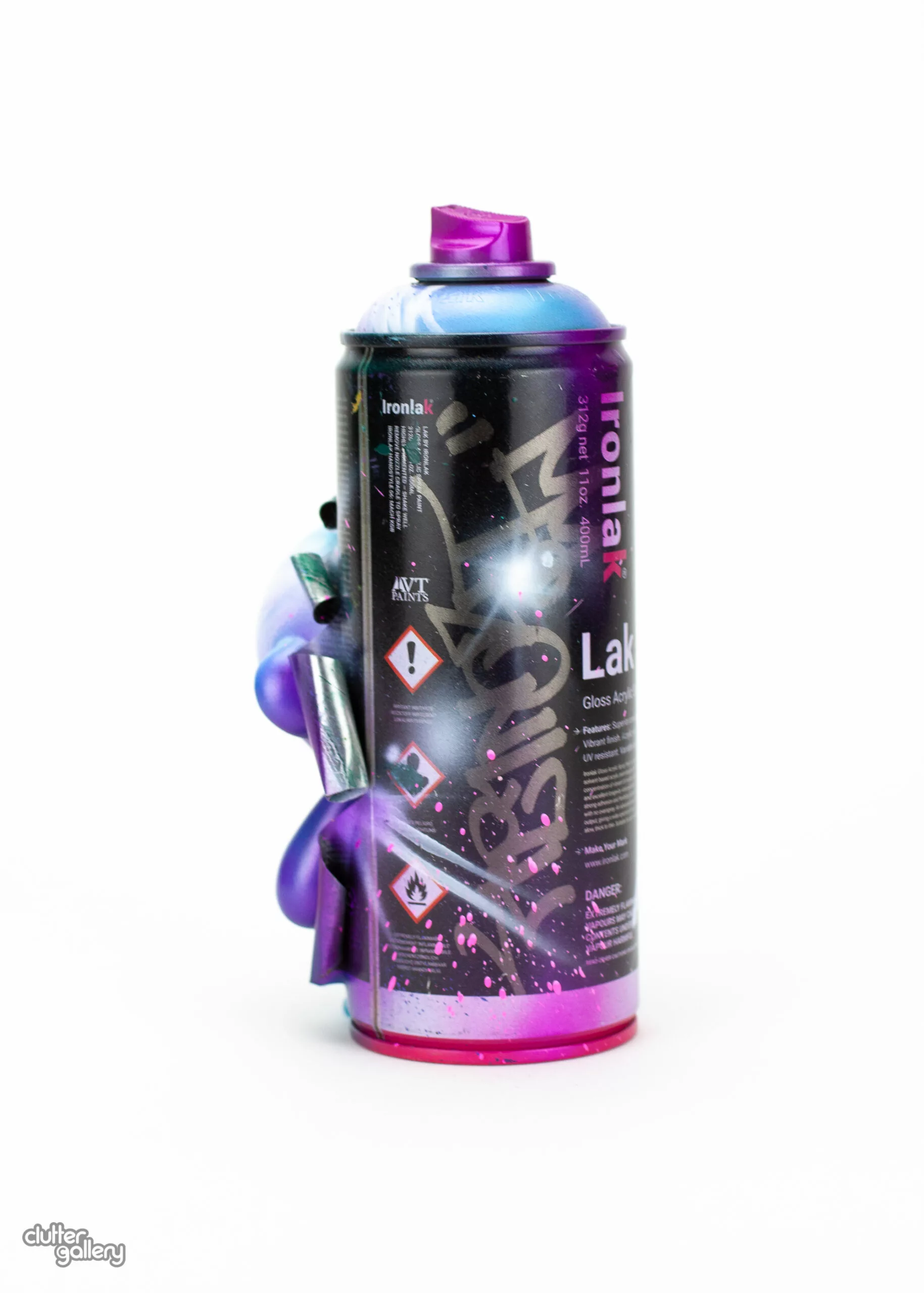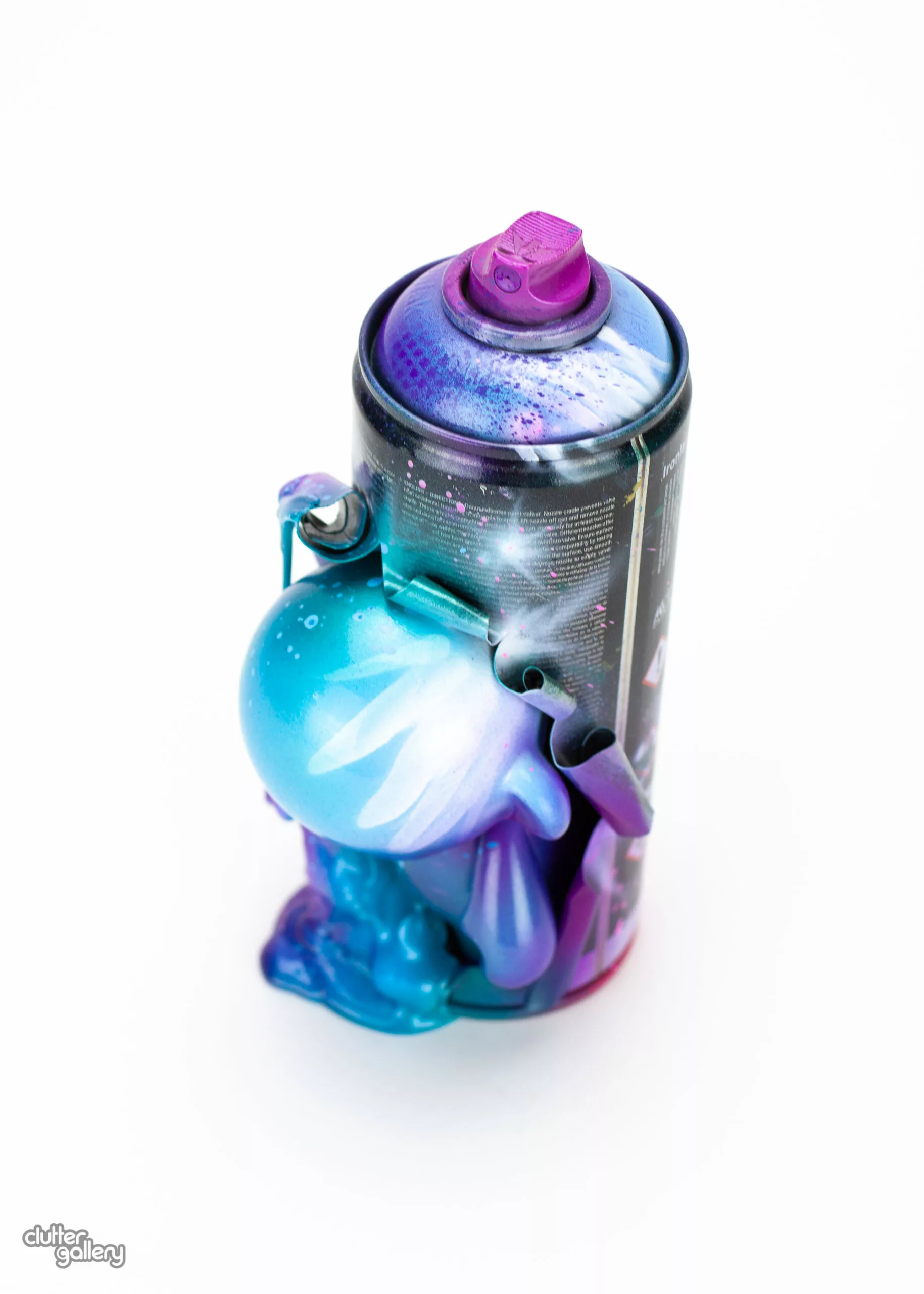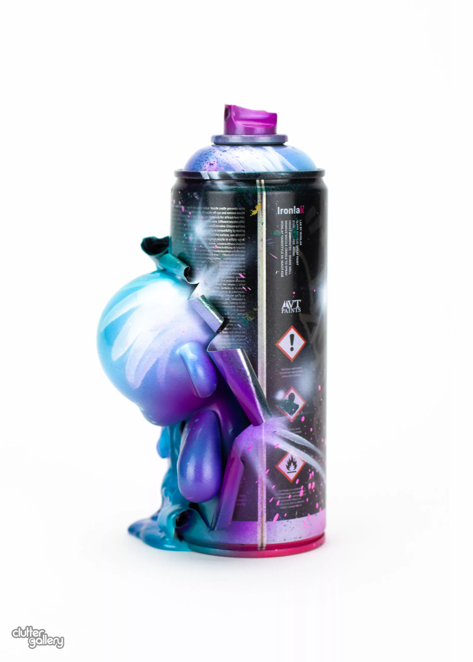 Color crafted bombers! Exclusive for Clutter Gallery’s gift wrapped art show, each of these “Bombers” features a 4” Kidrobot Munny busting out of a REAL spray paint can. Upcycled artwork, UV and Kandy paints, with a DURABLE coating. 7″ Tall.