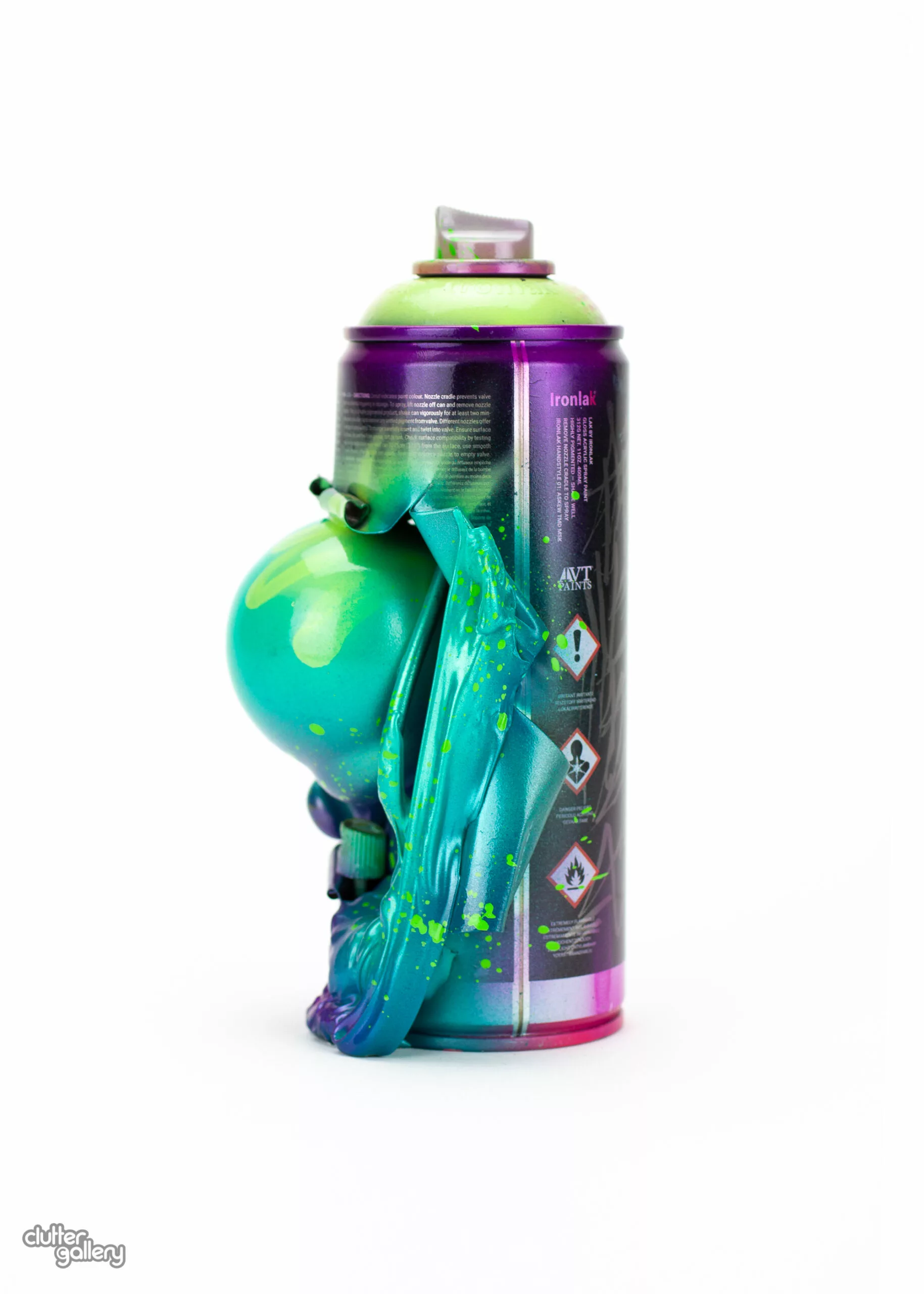 Color crafted bombers! Exclusive for Clutter Gallery’s gift wrapped art show, each of these “Bombers” features a 4” Kidrobot Munny busting out of a REAL spray paint can. Upcycled artwork, UV and Kandy paints, with a DURABLE coating. 7″ Tall.