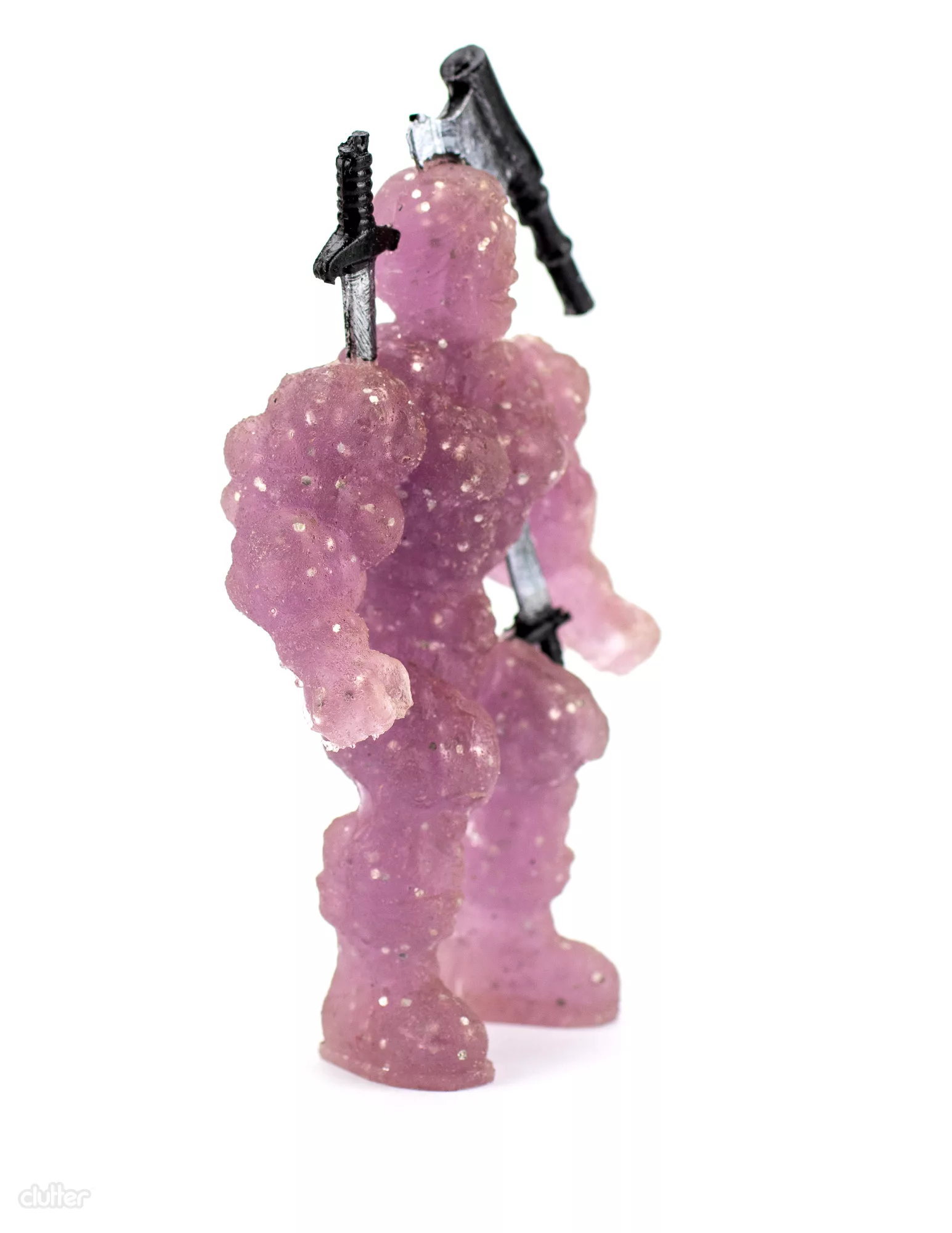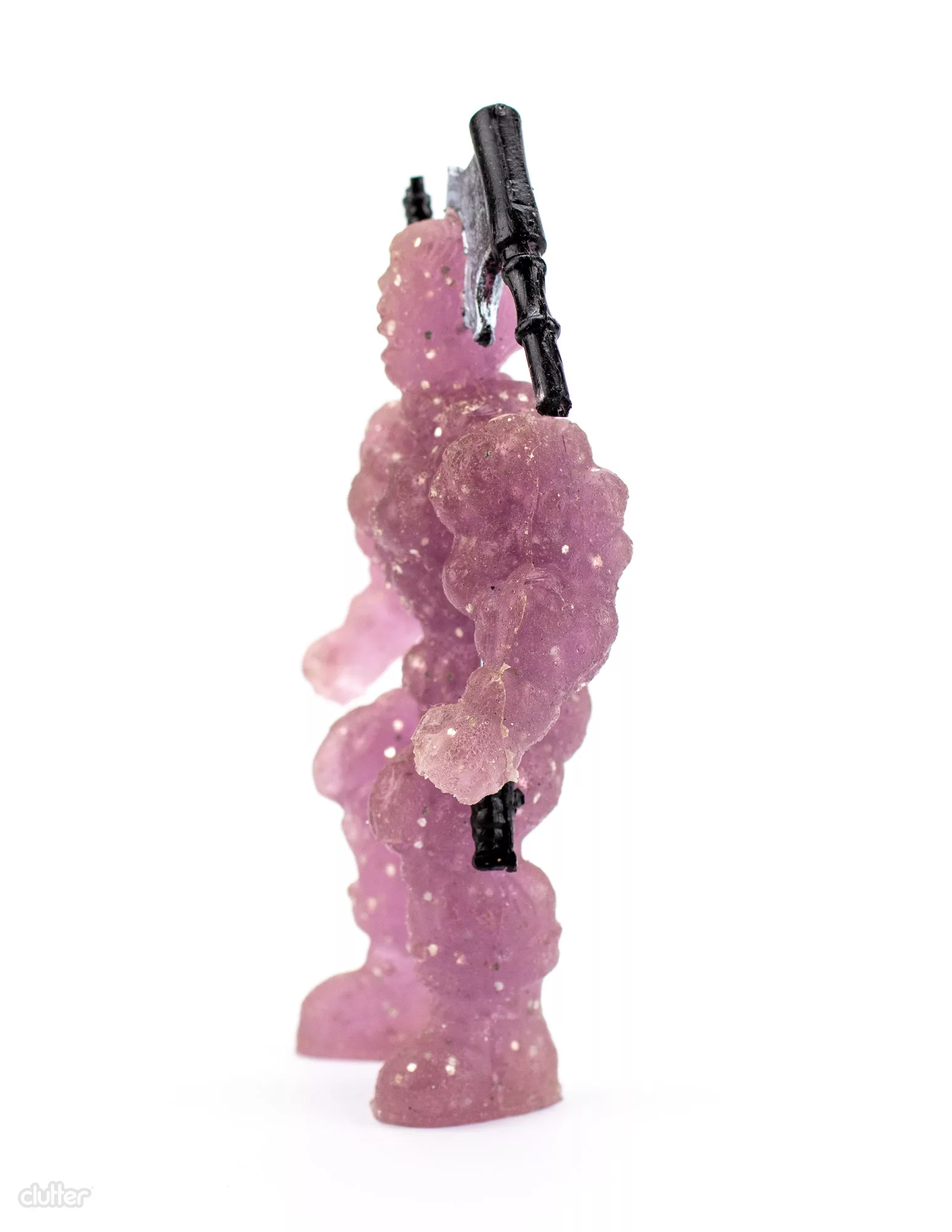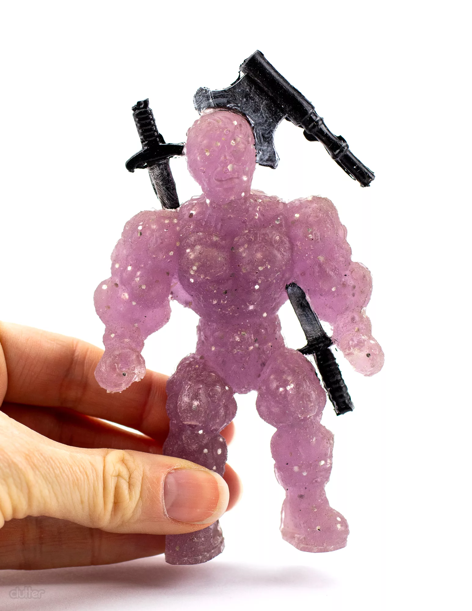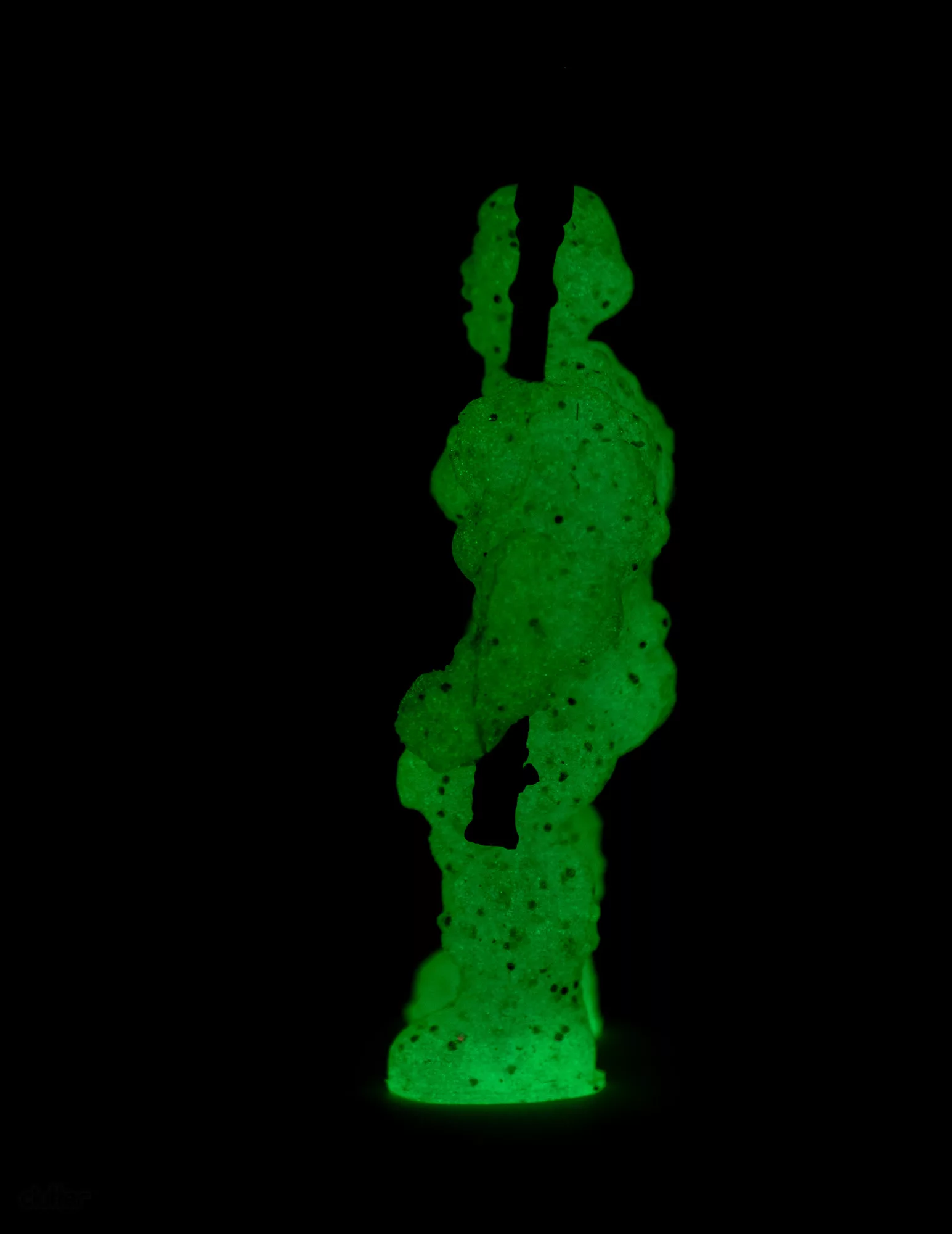 Original character from The Musculoids Miltiverse. Glow-in-the-dark glitter rubber, hand-cast from a silicone mold.