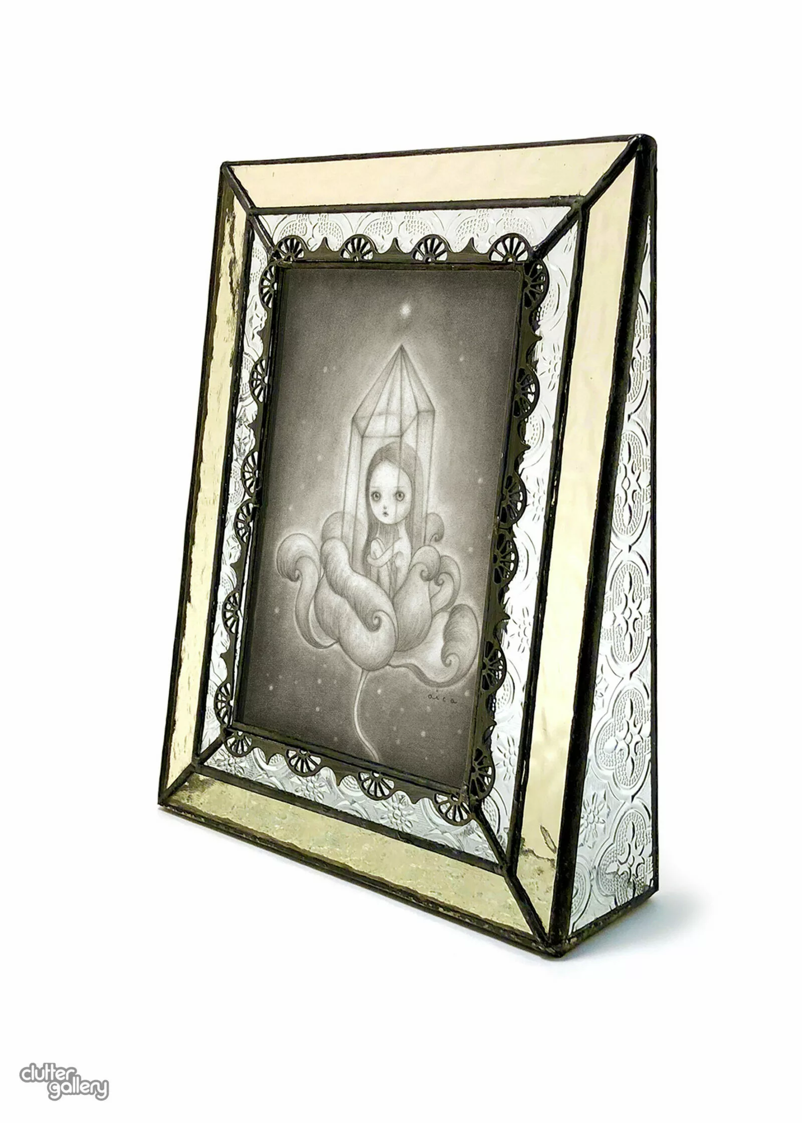 Hand drawn graphite on Arches 300gsm paper, in antique stained glass tabletop frame measures approx. 8 1/2 x 6 3/4 x 1 7/8”