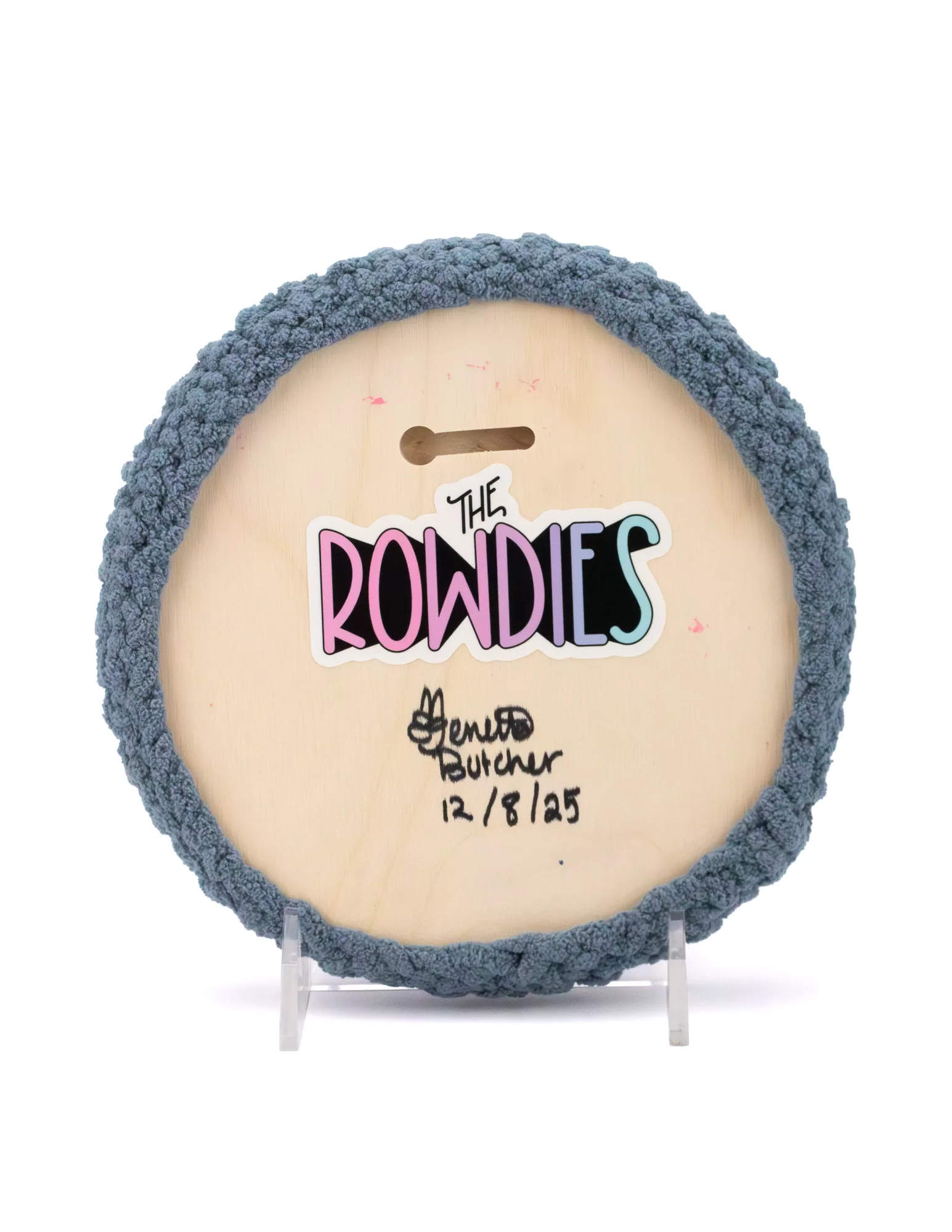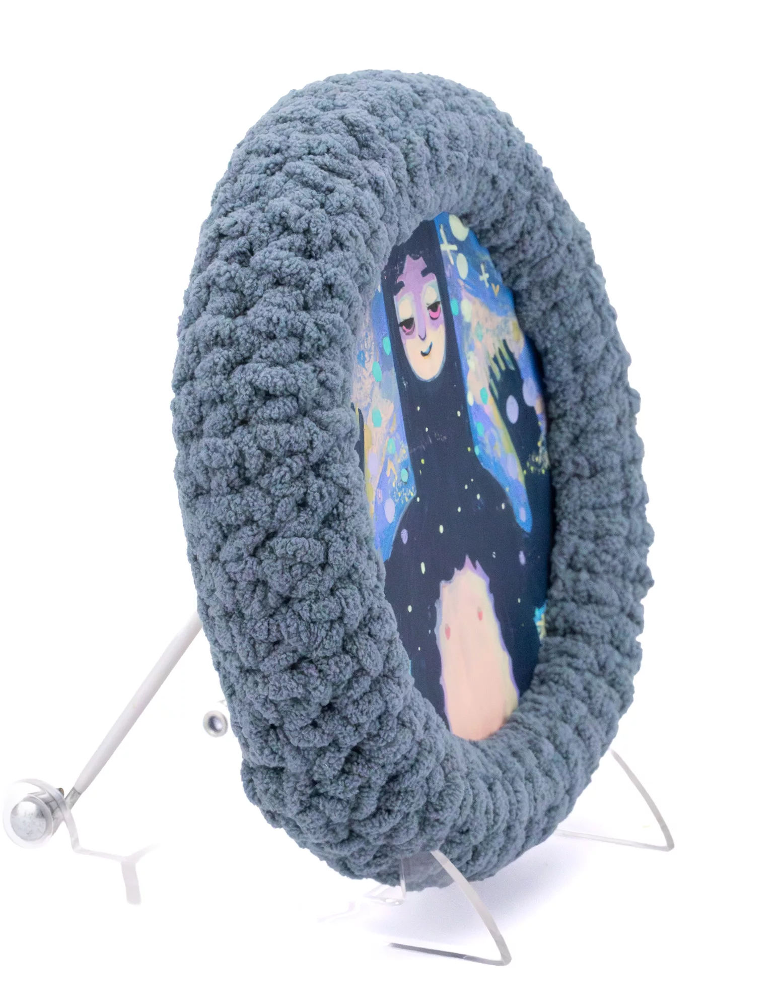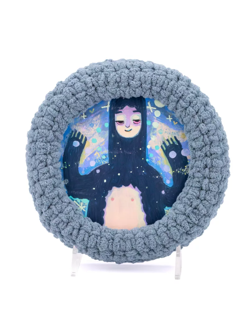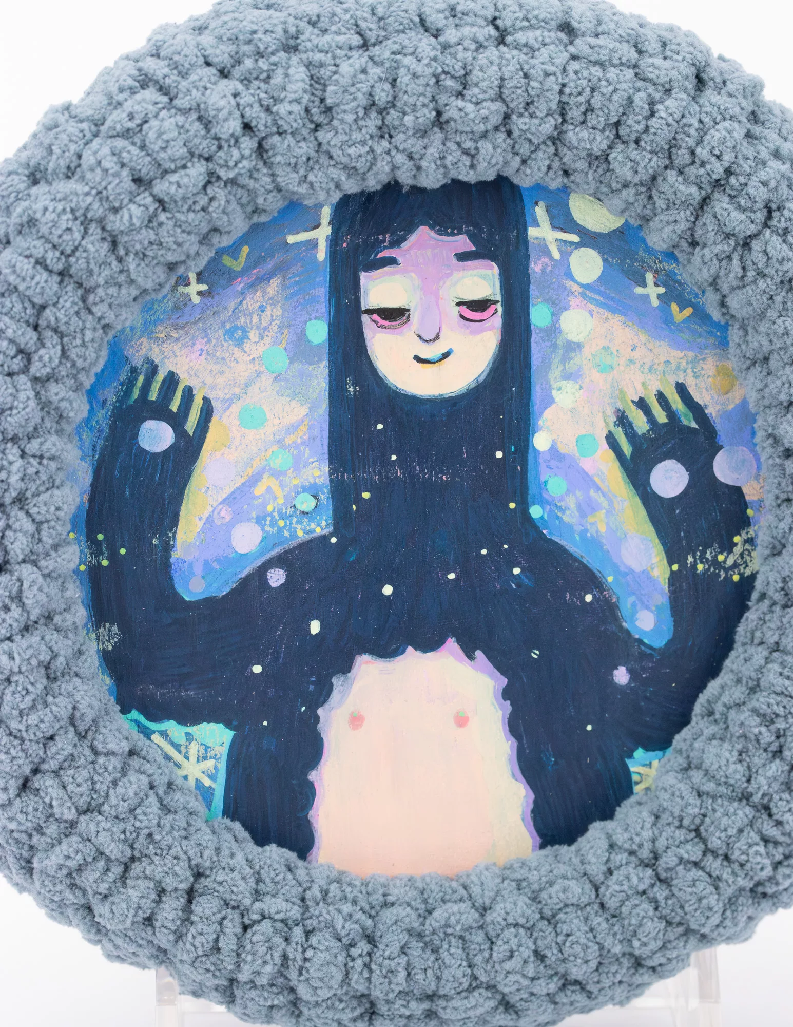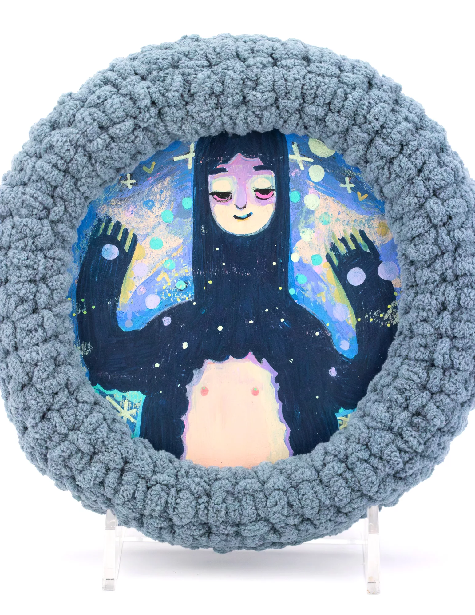 8x8in acrylic on birch round panel with yarn border