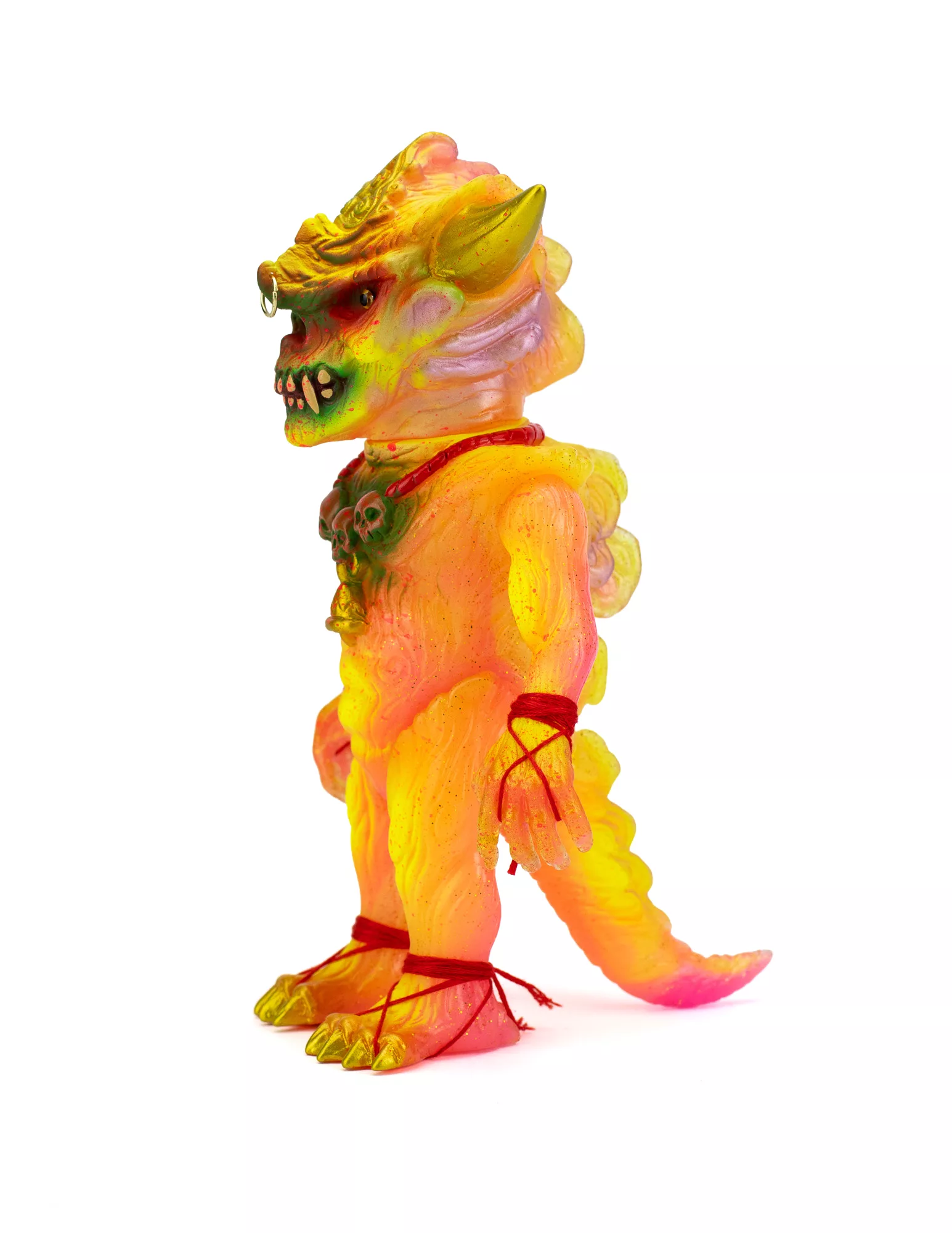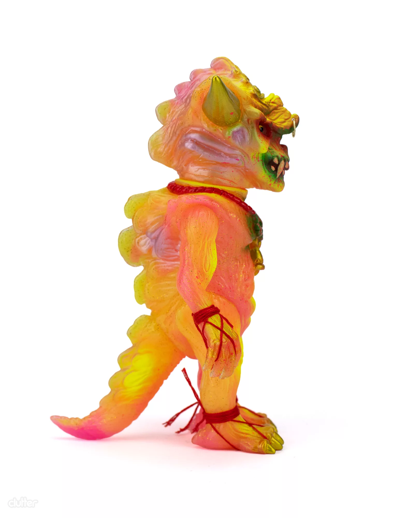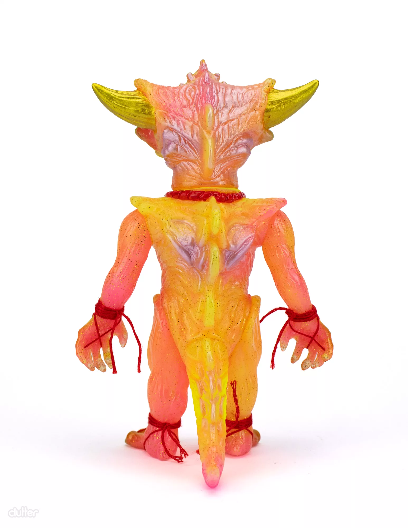 Japanese sofubi toymaker, Shirahama Toy has done an amazing double pour on the Apalala sculpt from Devils Head Productions. The outer pour is clear vinyl with gold glitter while the inner pour features marbled GID pink and GID yellow vinyl. The Widowmaker “B” features red, tan, brown, green, fluorescent yellow, fluorescent pink, gold, and metallic pink paints. A gold metal piercing, yellow glass eyes, and red cord arm/feet wraps complete this amazing 1-off toy. Comes with headercard and stickers.