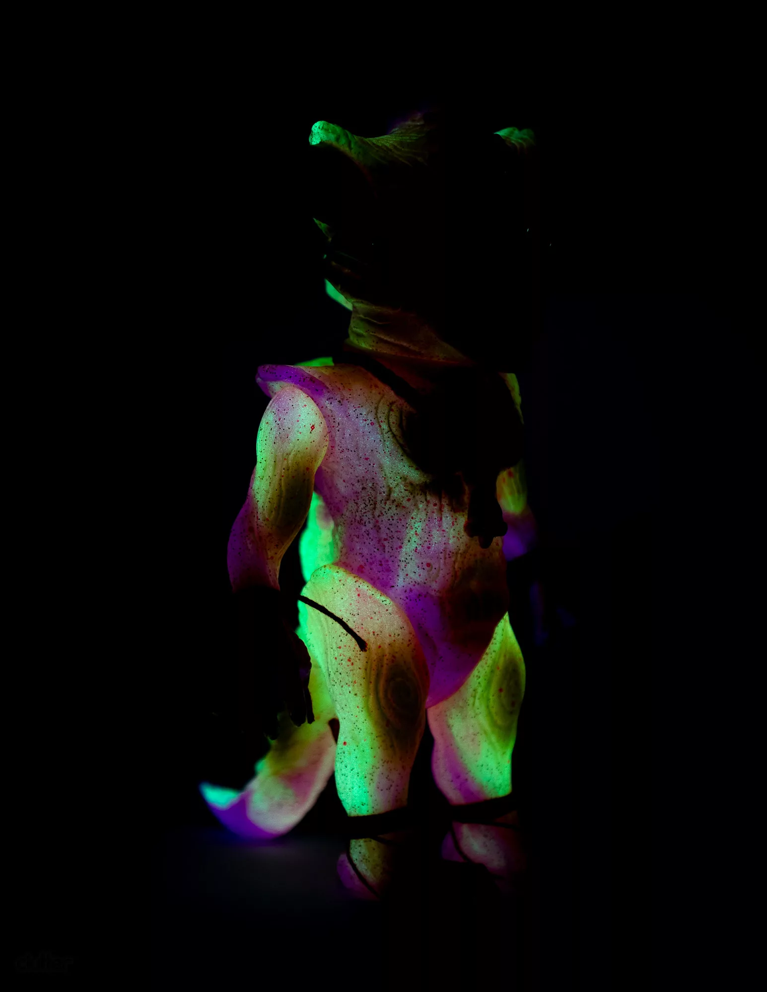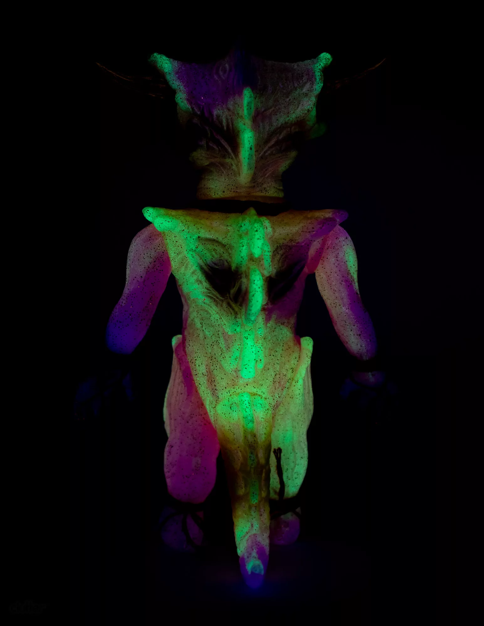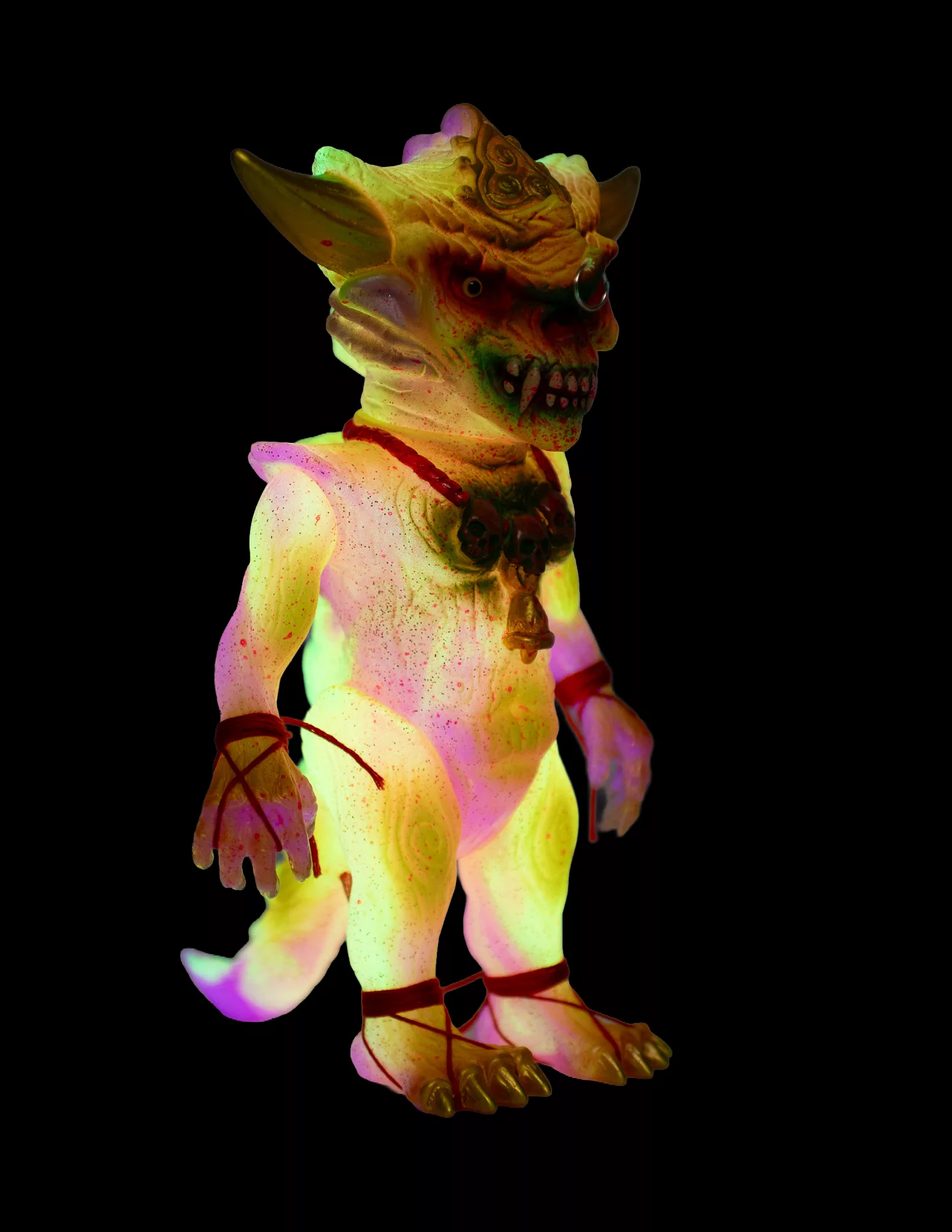 Japanese sofubi toymaker, Shirahama Toy has done an amazing double pour on the Apalala sculpt from Devils Head Productions. The outer pour is clear vinyl with gold glitter while the inner pour features marbled GID pink and GID yellow vinyl. The Widowmaker “B” features red, tan, brown, green, fluorescent yellow, fluorescent pink, gold, and metallic pink paints. A gold metal piercing, yellow glass eyes, and red cord arm/feet wraps complete this amazing 1-off toy. Comes with headercard and stickers.