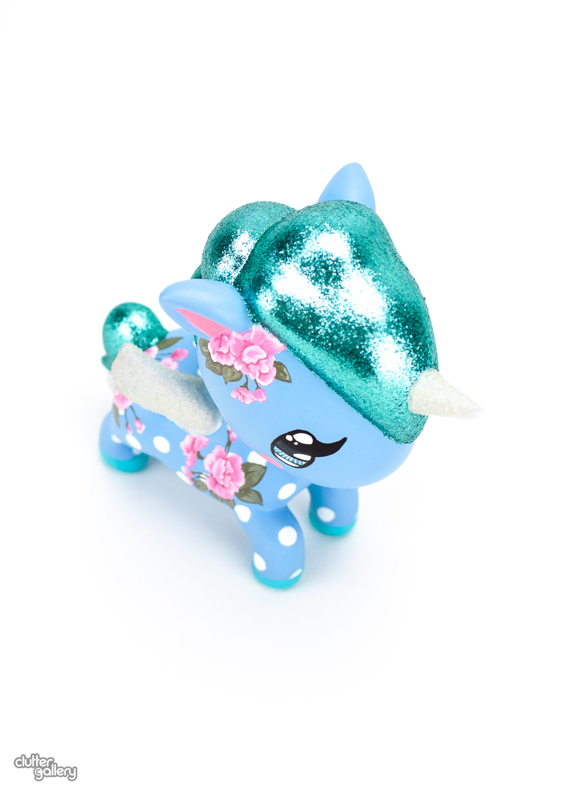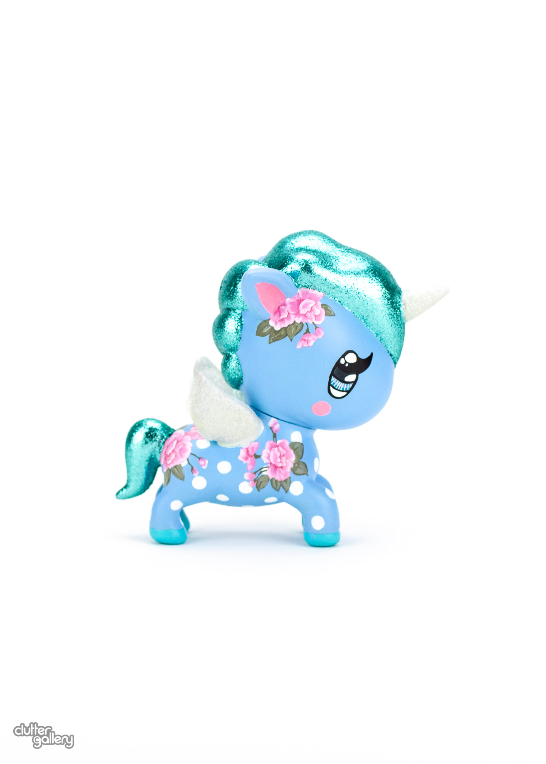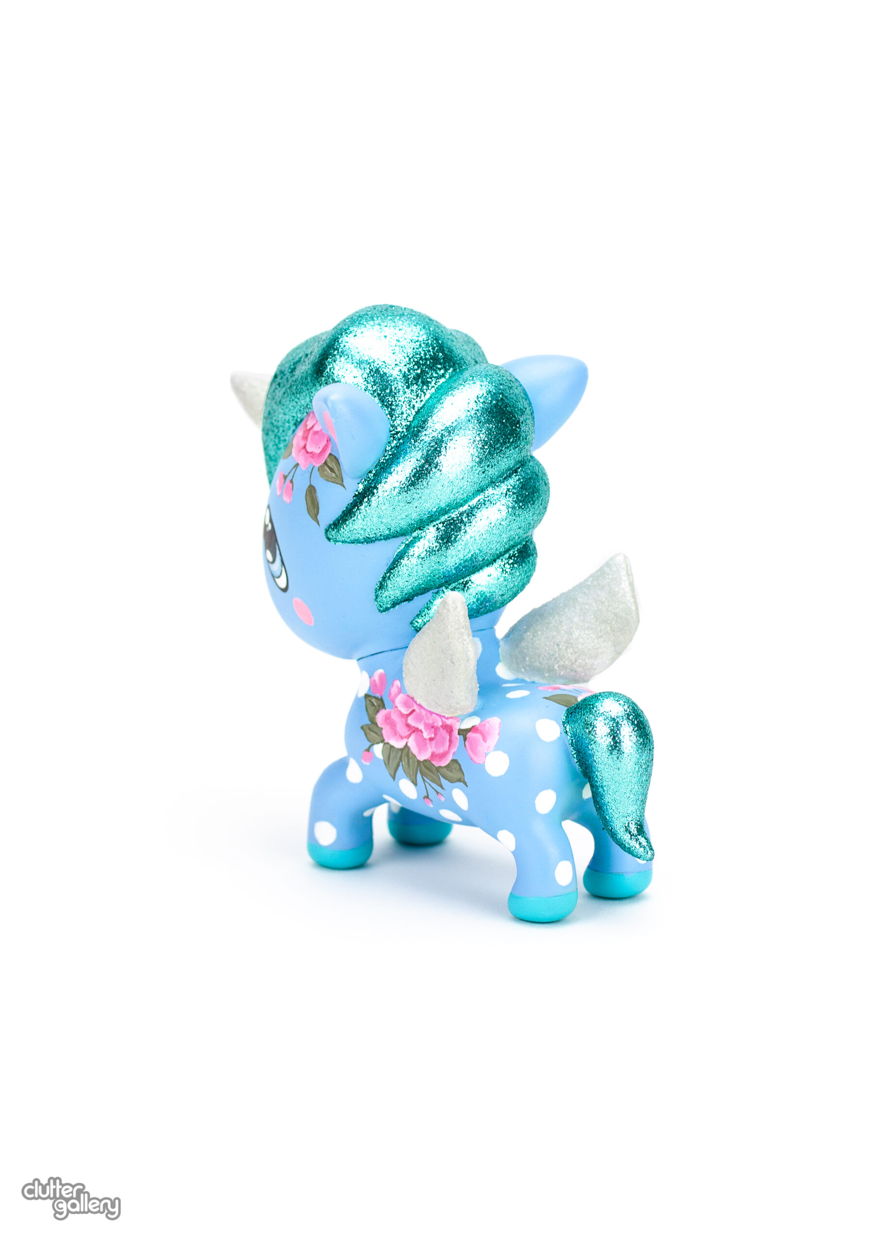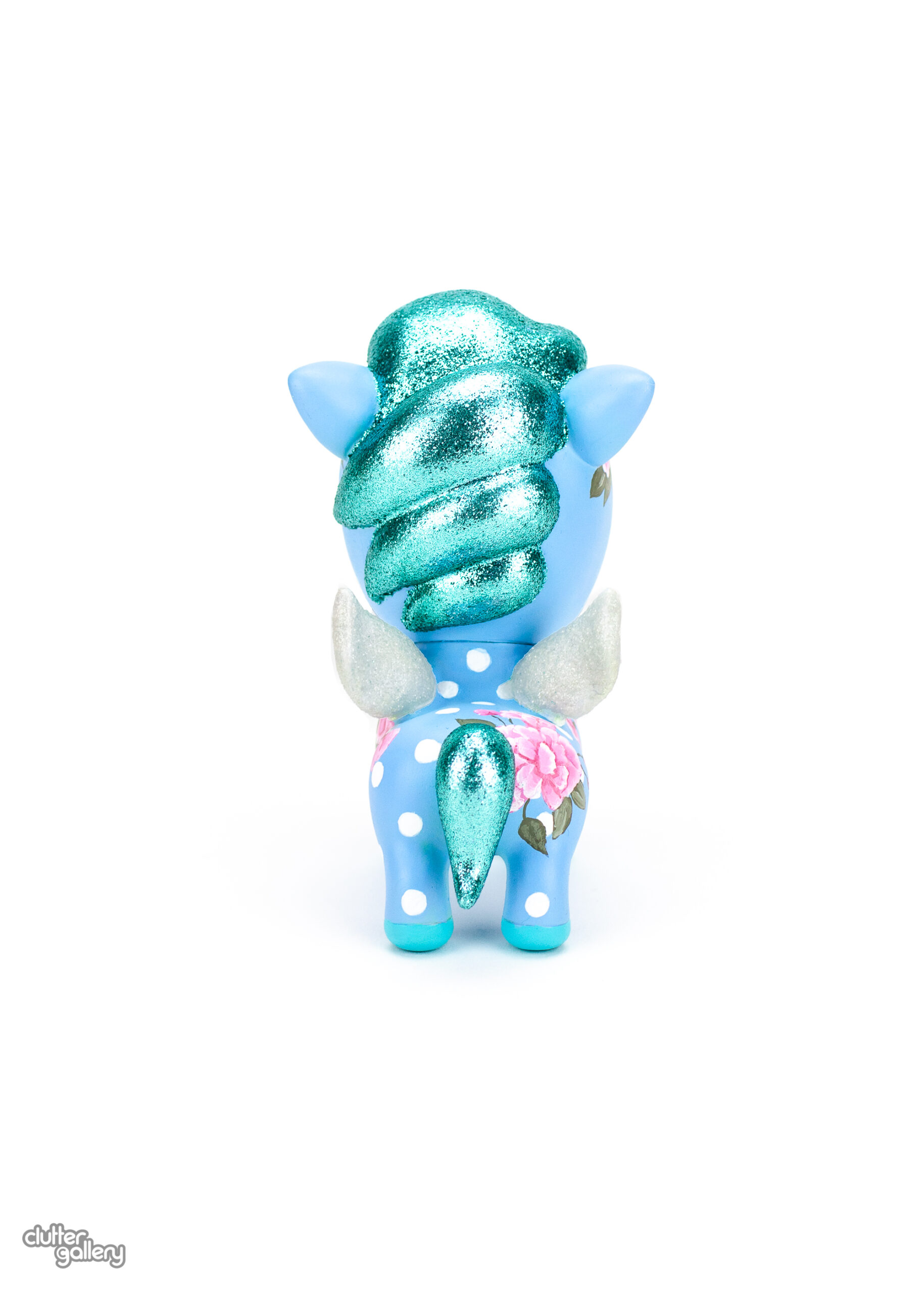 Hand-painted 5″ Tokidoki Blue Unicorno covered in polka dots, florals, a glimmering mane, and sugar encrusted wings.