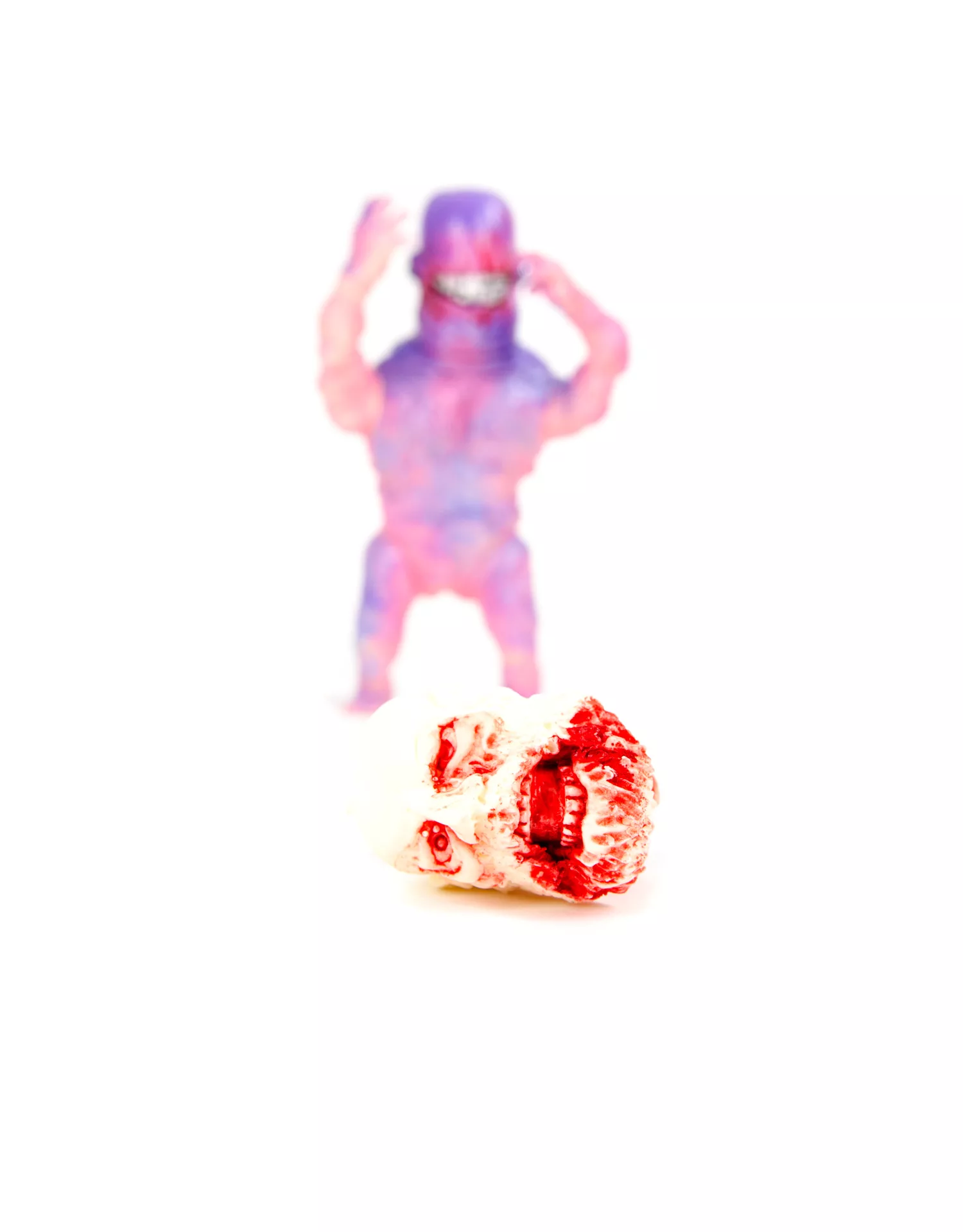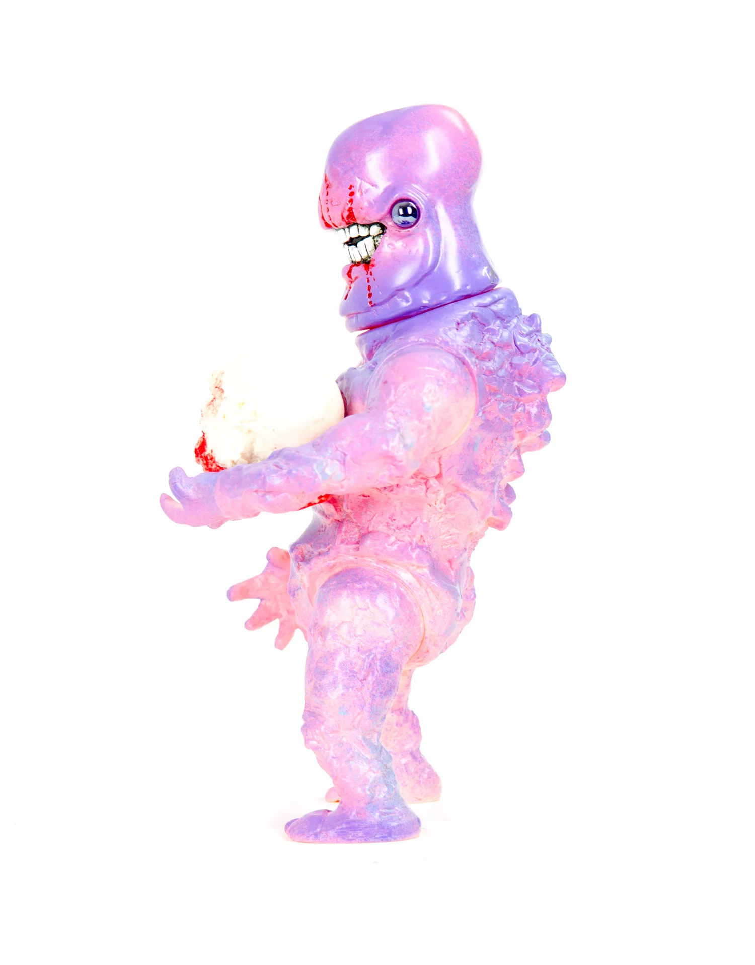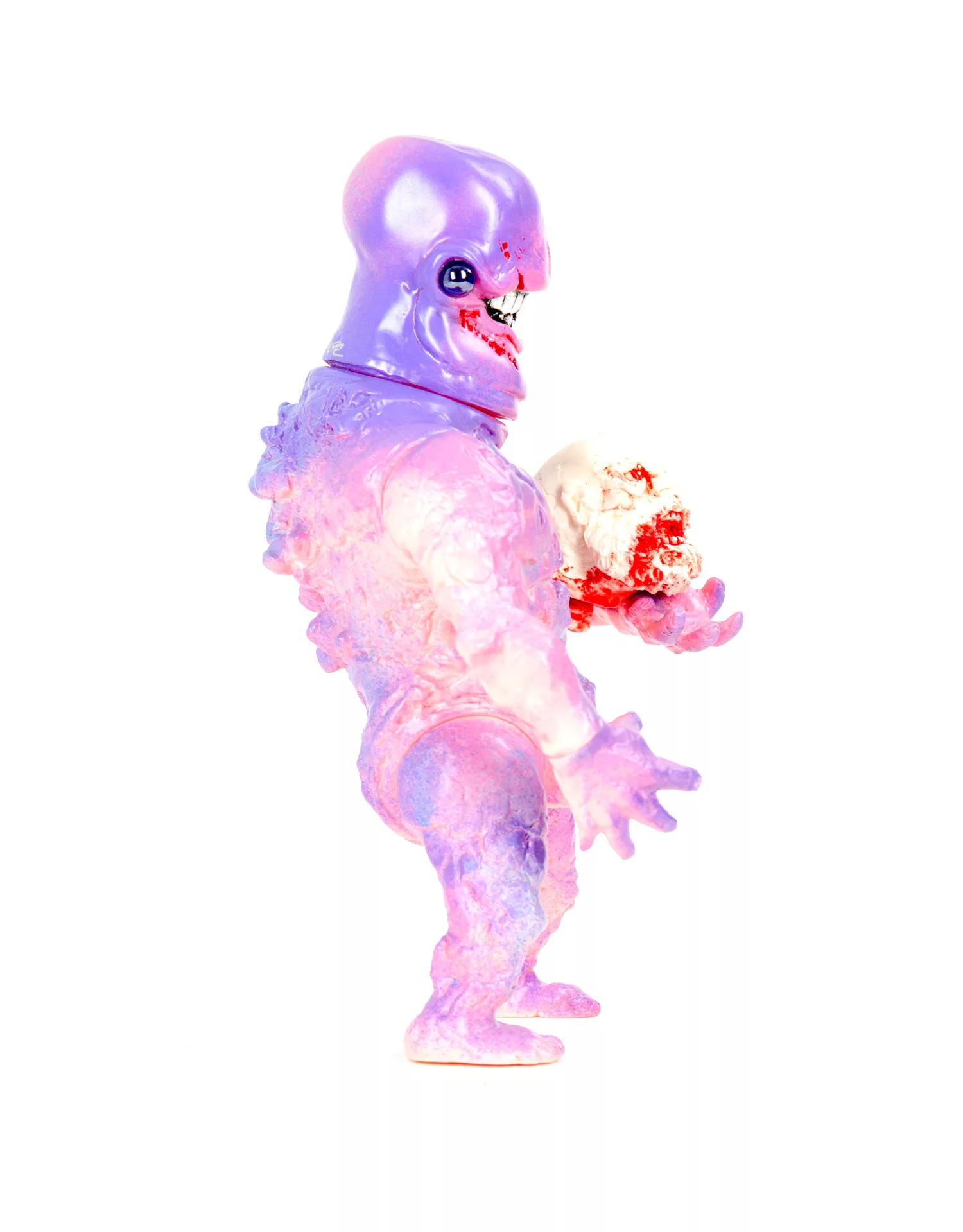 One Of A Kind Custom – 10″, Glow in The Dark Vinyl. A Mashup of the PLT “Coolie Body” with a Plaseebo Gnaw Head with Glass Eyes. Has an Internal Motion Activated color-changing LED unit with replaceable batteries. Comes with a hand cast Plaseebo resin severed head. Hand signed, 2017.