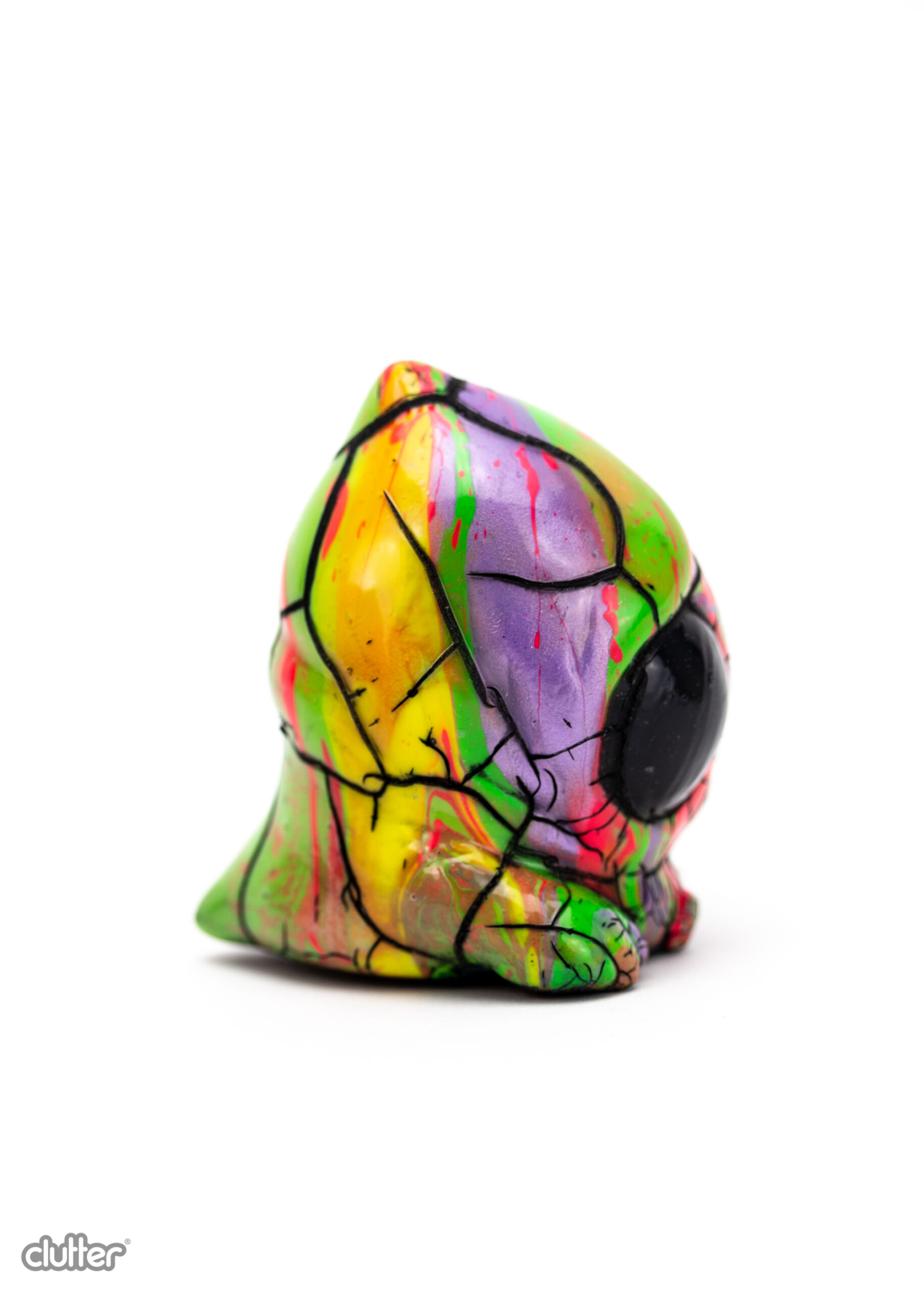 3.5″ custom Figgle Bits By Chris Ryniak x Squibble. Unique neon Marbled paint job with black cracks on top. SHIPPING INFORMATION: All gallery items will be shipped within 10 business days of the exhibition’s conclusion. One-off Pieces will remain on display for the duration of the exhibit. Shipping charges for gallery exhibition pieces will be invoiced separately. Shipping invoices will be sent within approximately 10 business days of the exhibit’s end, or — in the case of already completed exhibits — within 4 business days of the order being placed, unless shipping is calculated at the time of check out. Domestic orders will receive a PayPal request for shipping, international orders will be emailed.