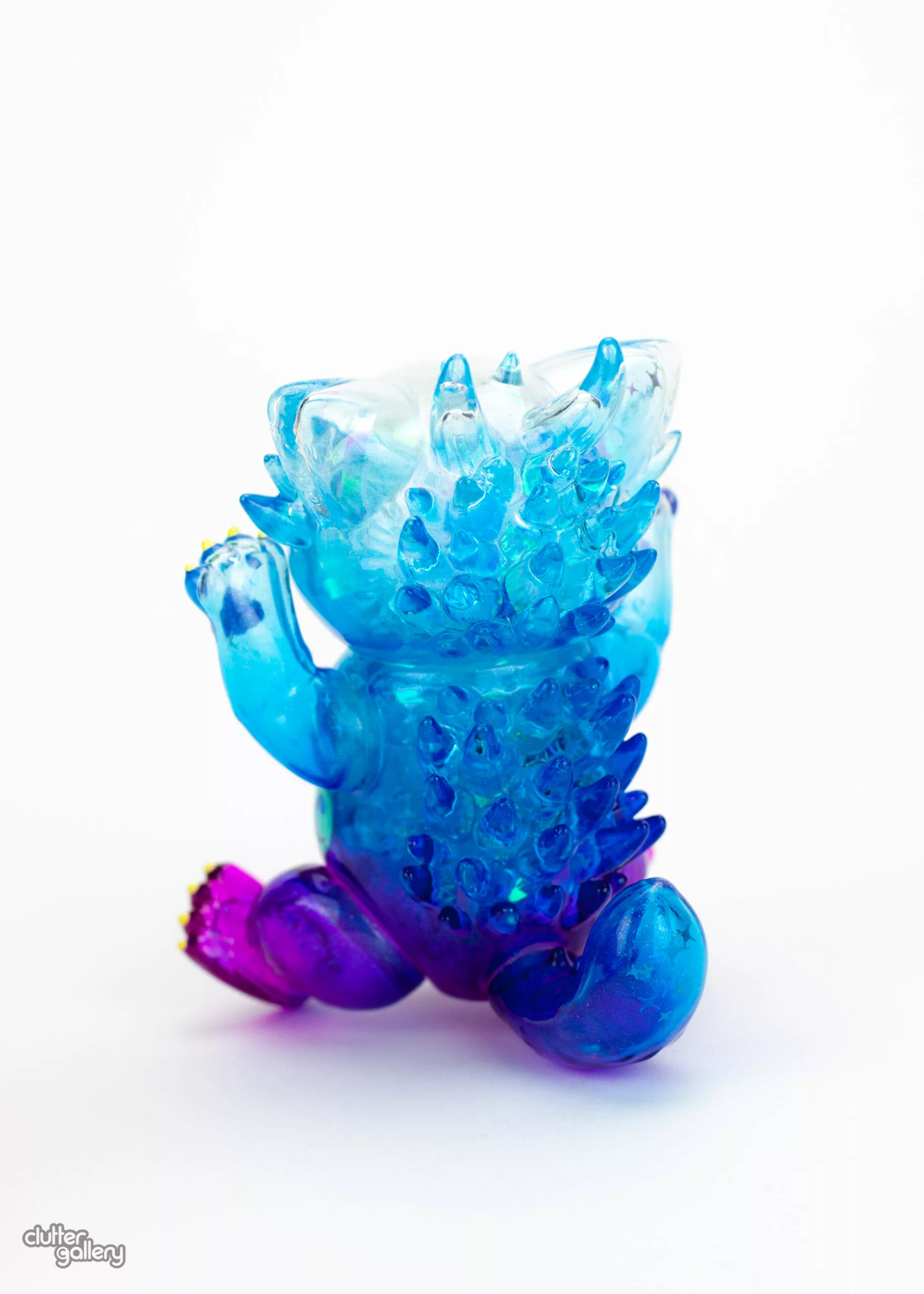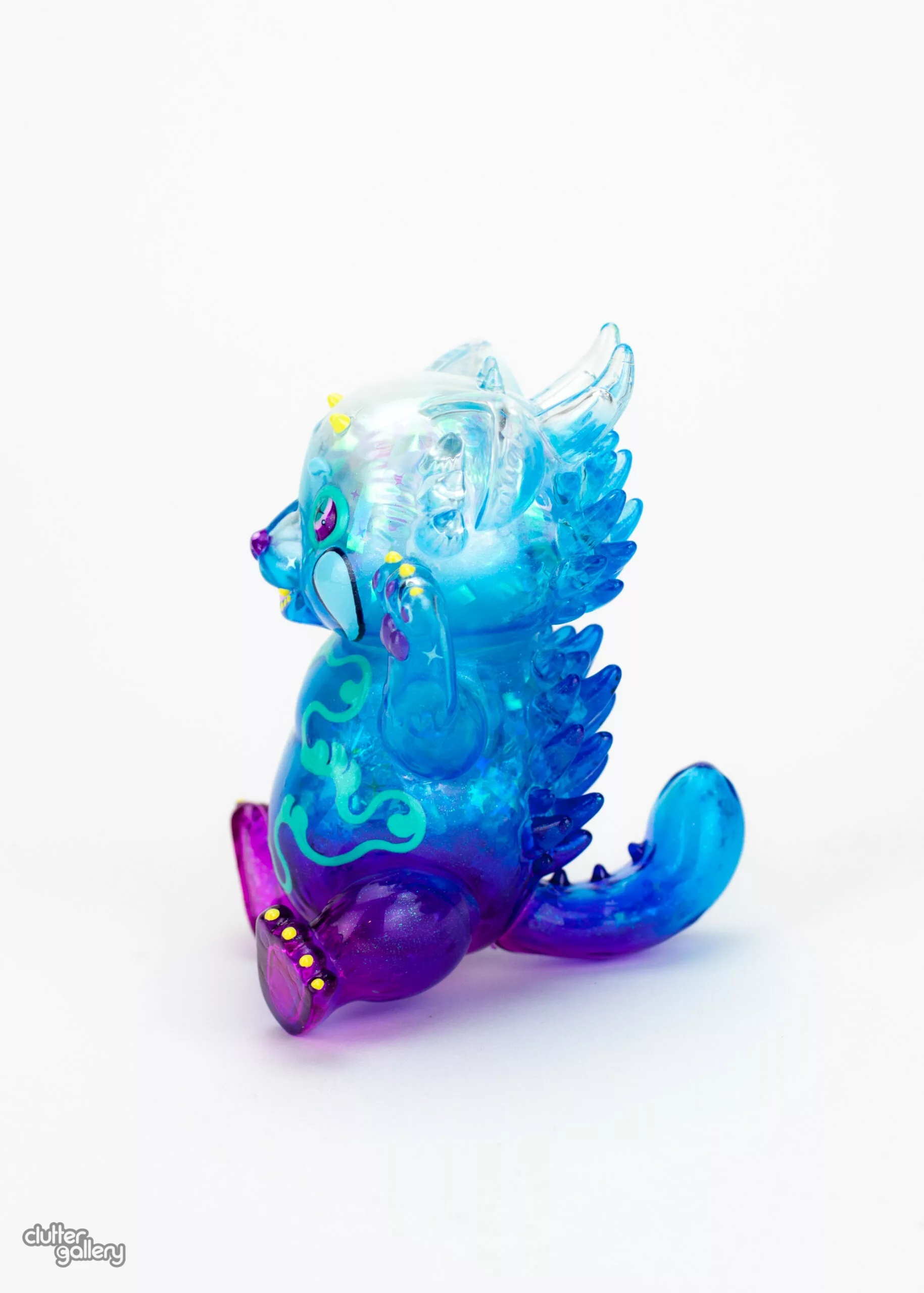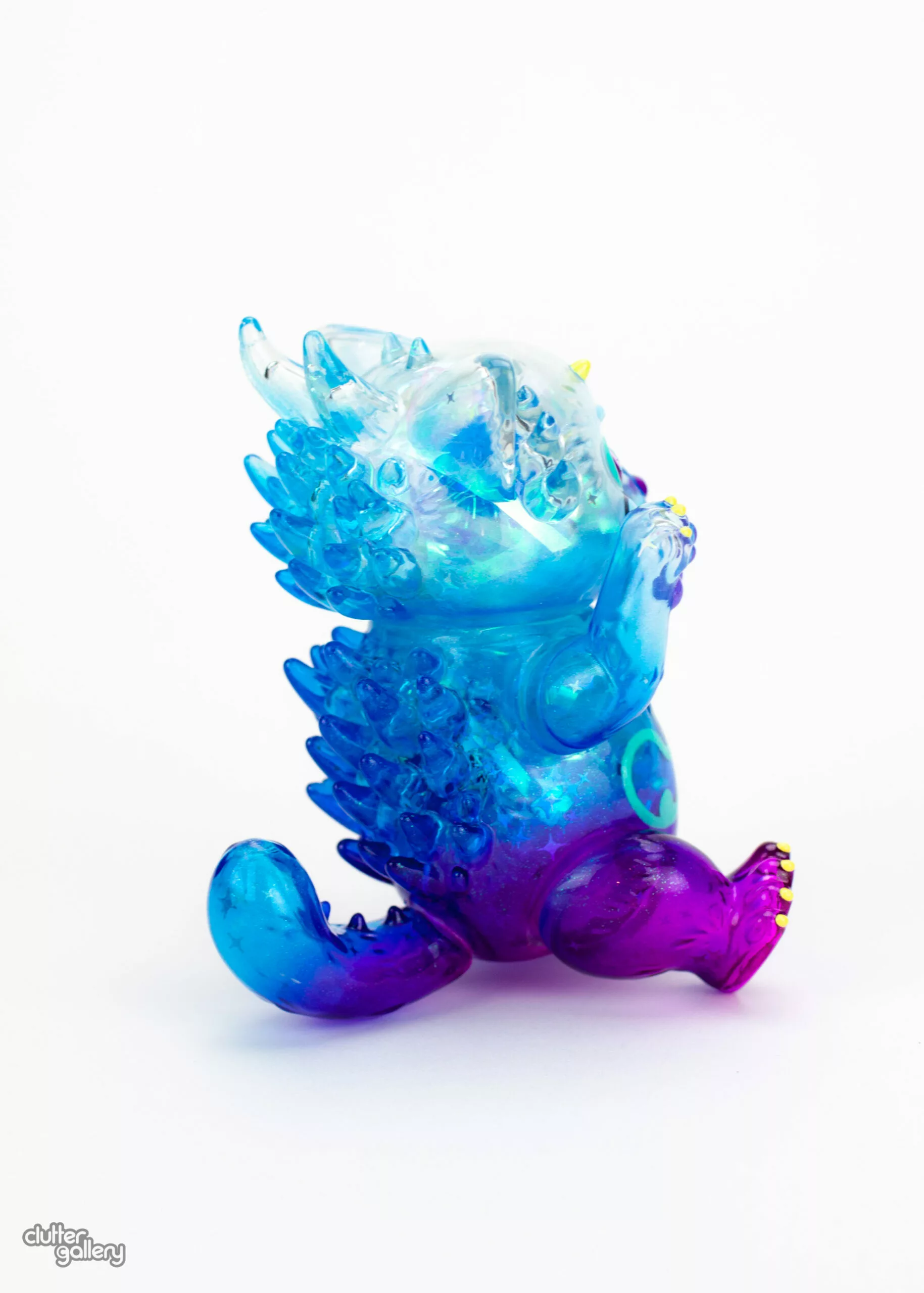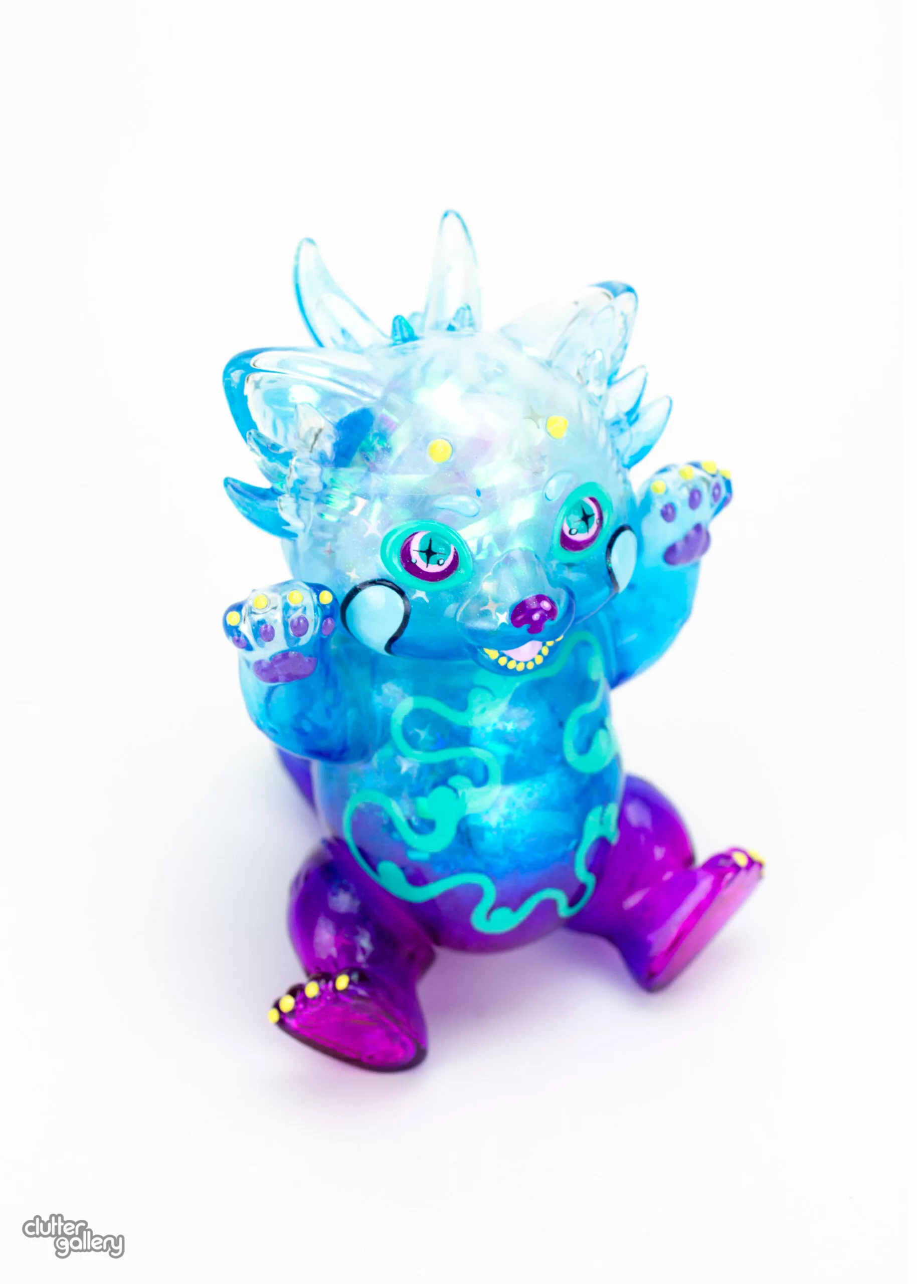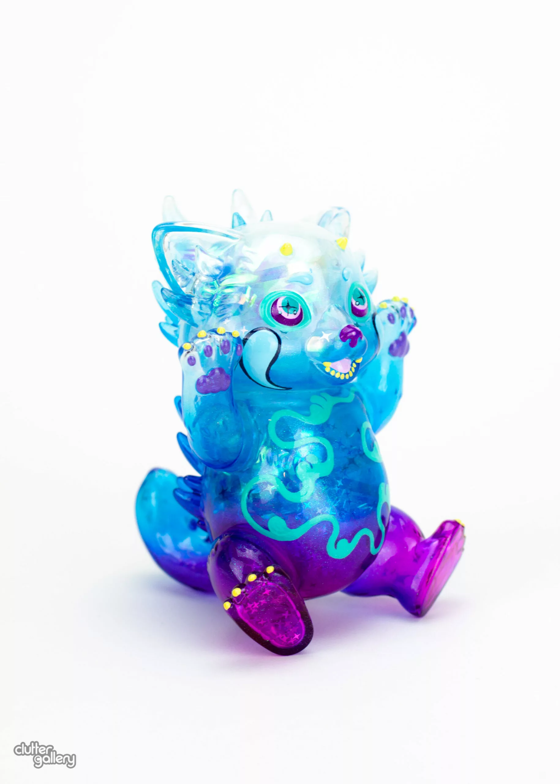 Clear soft vinyl painted with Cthru paints and filled with iridescent cellophane, sparkly pom poms, and glitter for maximum sparkle. 5″ Tall