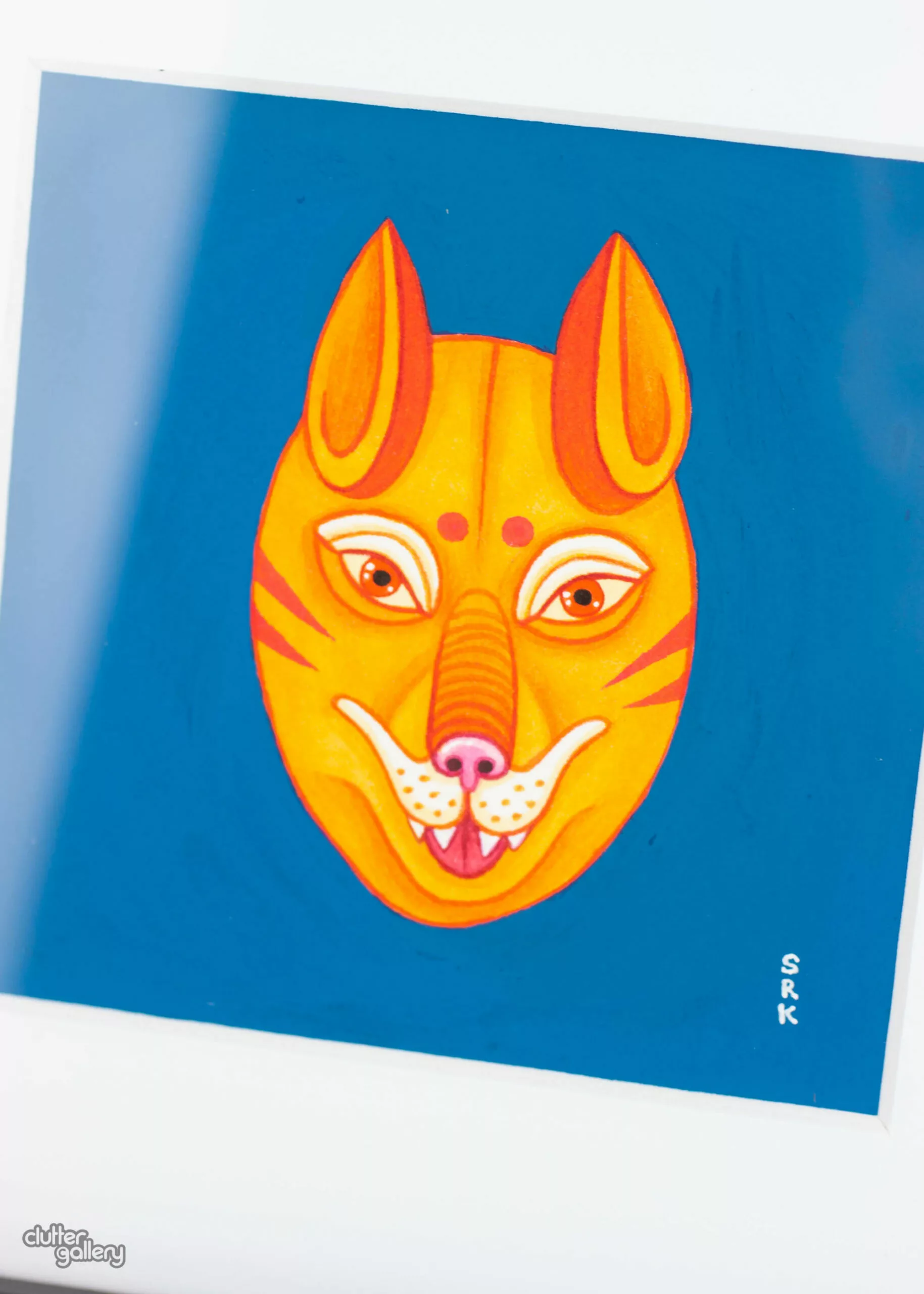 One of a series of four mini paintings, each interpreting a different traditional mask. This piece was inspired by an antique Nepalese mask. watercolour, gouache, and ink on paper 5 x 5 inches, frame excluded