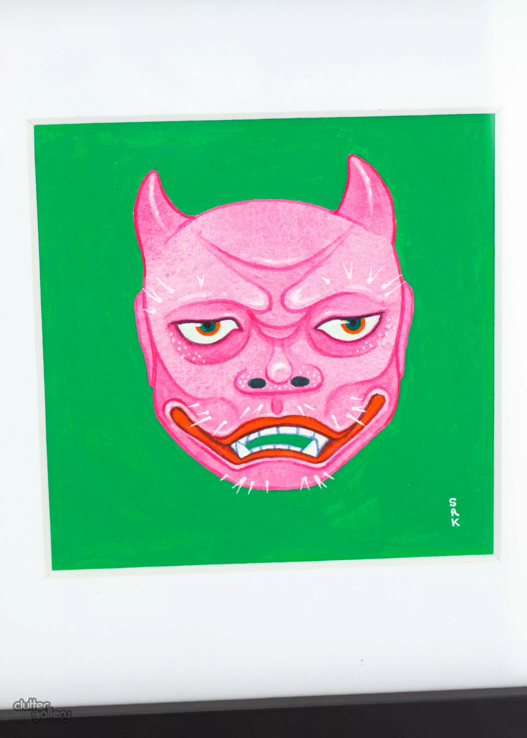 One of a series of four mini paintings, each interpreting a different traditional mask. This piece was inspired by the yakan (野干) mask used in traditional Japanese Noh theater – it is used to represent a malevolent spirit. watercolour, gouache, and ink on paper 5 x 5 inches, excluding frame