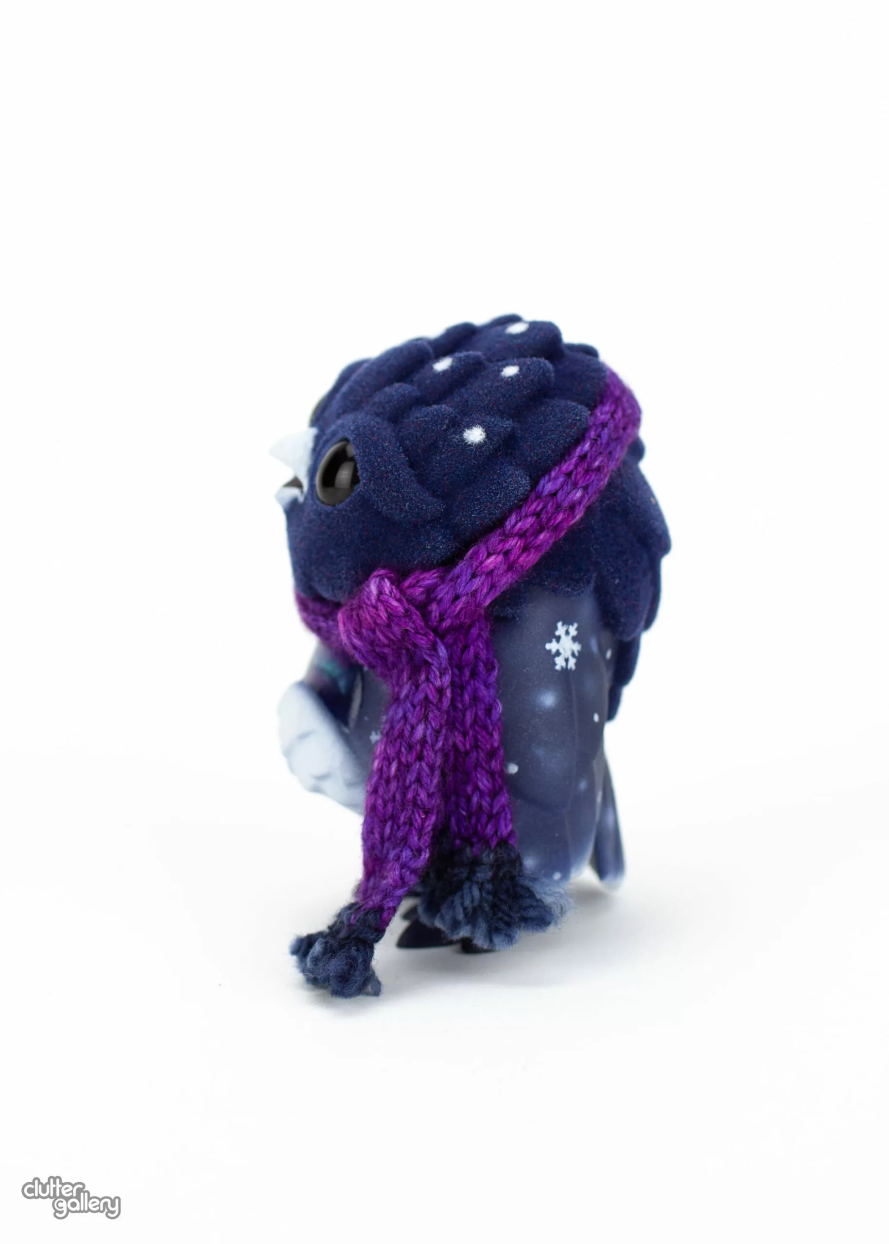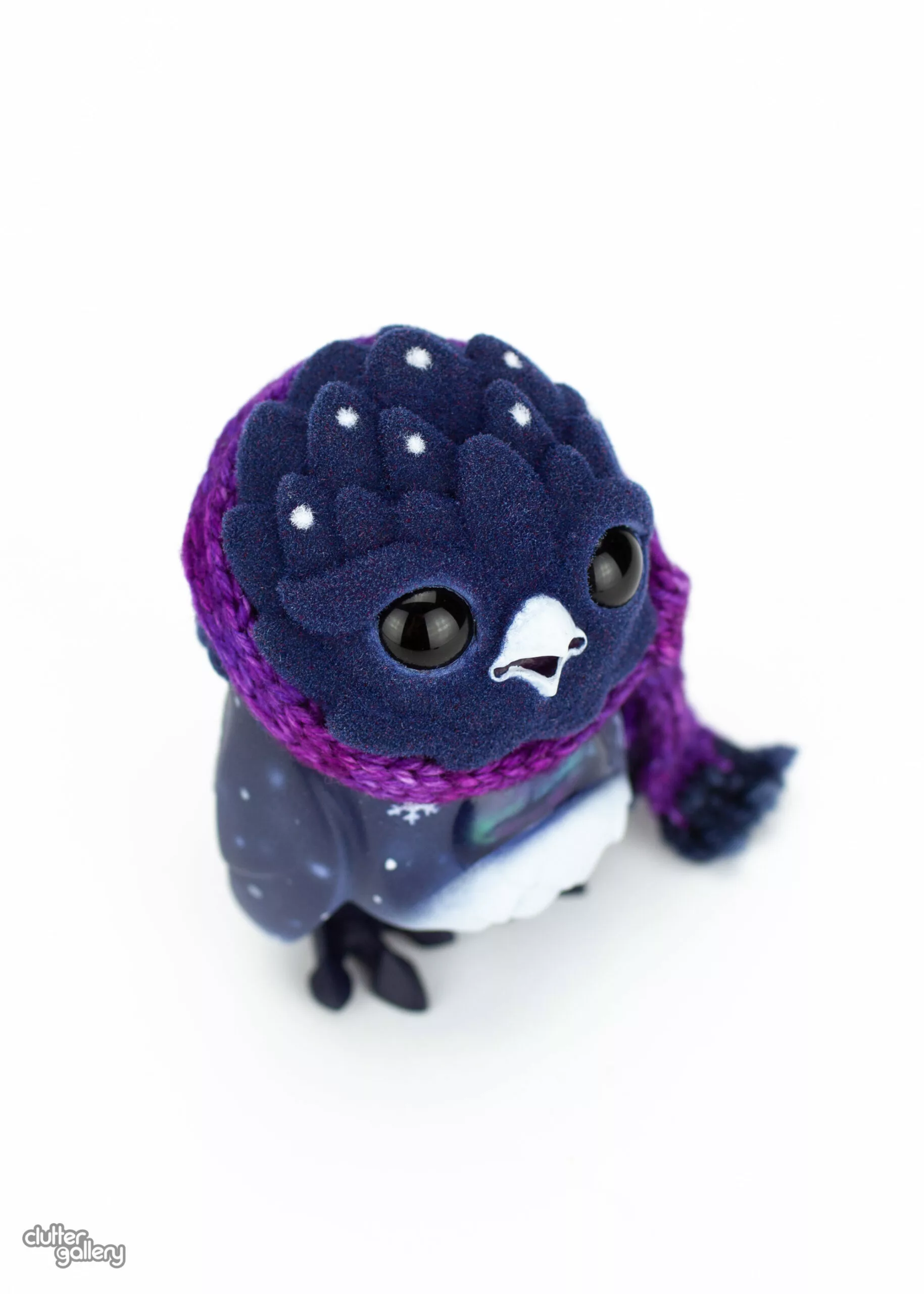 Custom 3.5″ Omen. Apoxie sculpt, acrylic, flocking powder, Madelinetosh yarn.