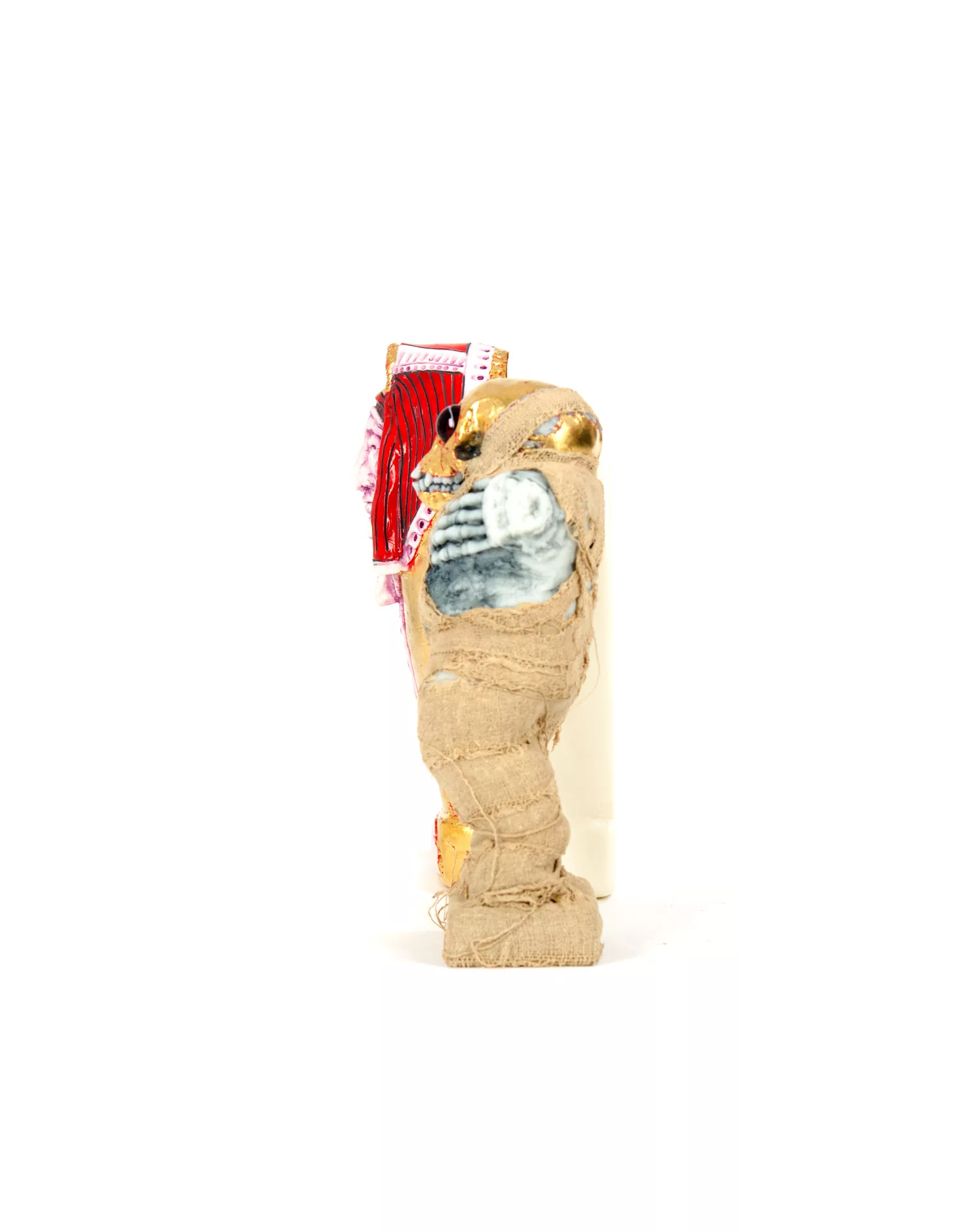 One Of A Kind Custom. Glow in the Dark Vinyl with paint, gold metal leaf, and fabric. 9″ Tall. Mummy has swirled red glass eyes and a motion activated color-changing LED unit inside body. Hand signed. 2017.