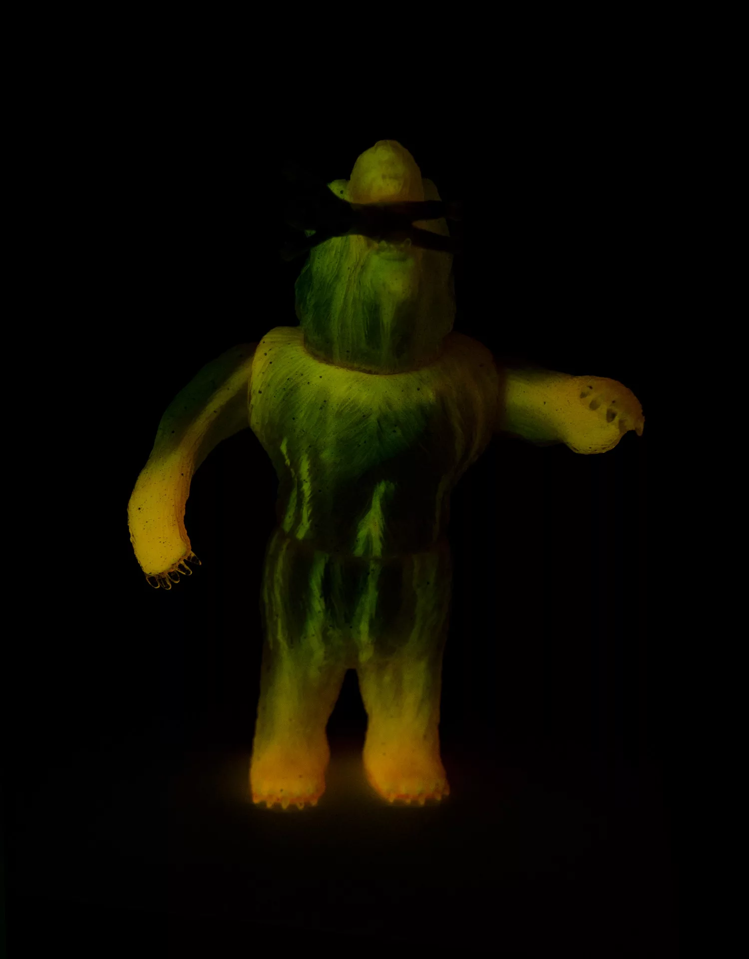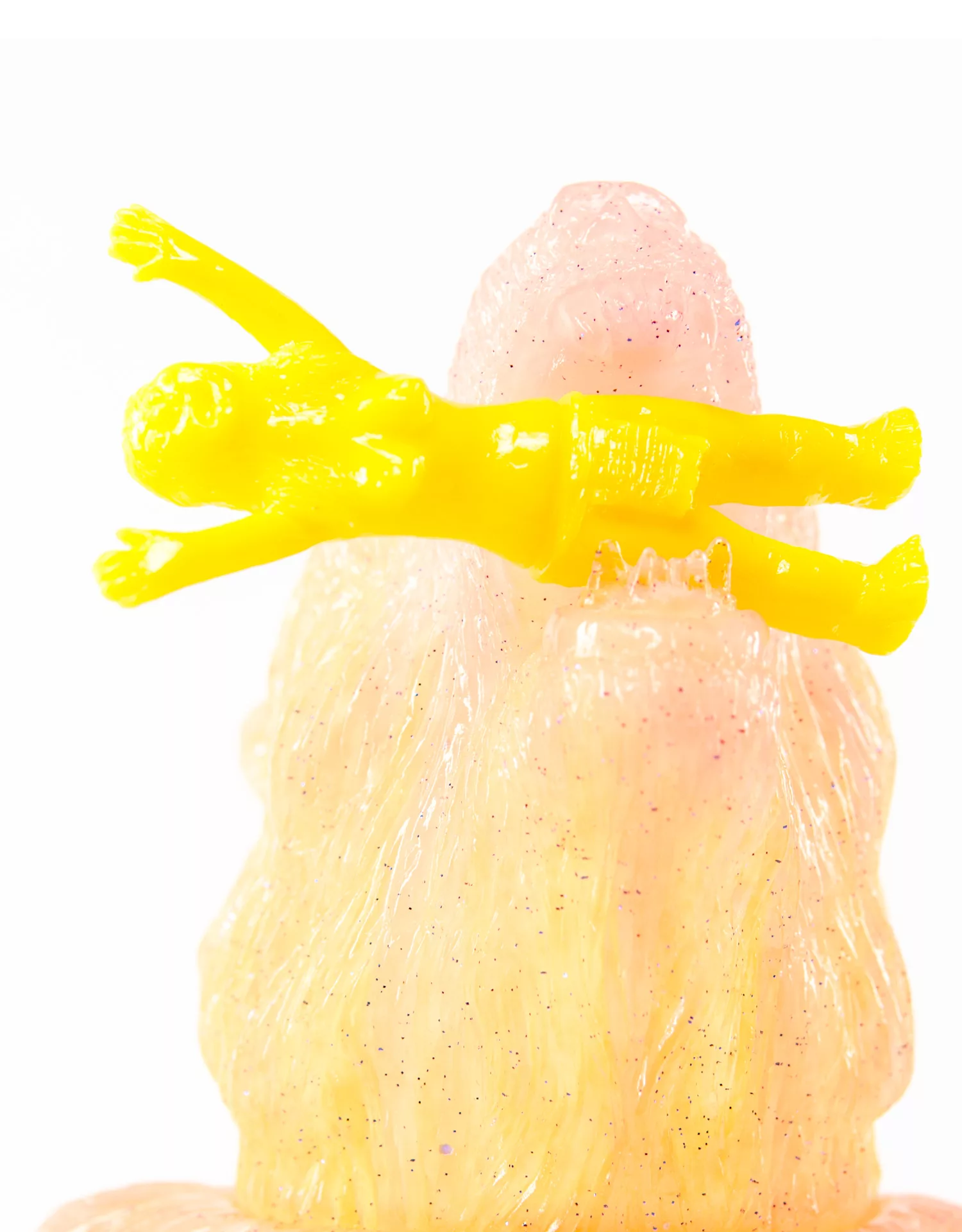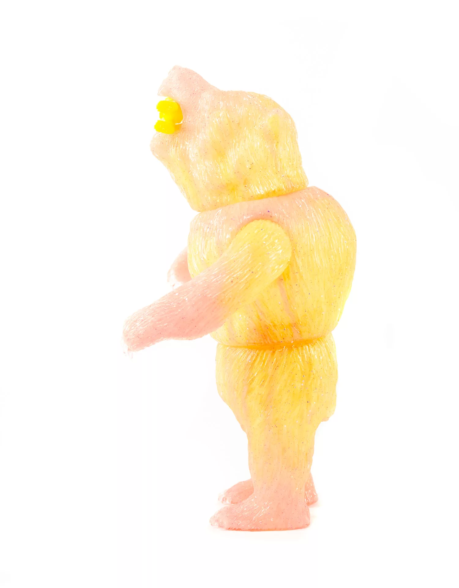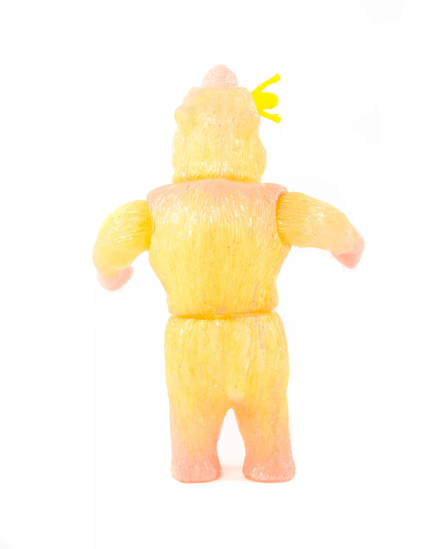 One Off Unique Double Pour Japanese Soft Vinyl. First Pour is Yellow and Pink GID marble, Second pour is clear with holographic and blue glitter. Comes with Clear Yellow Female Omake